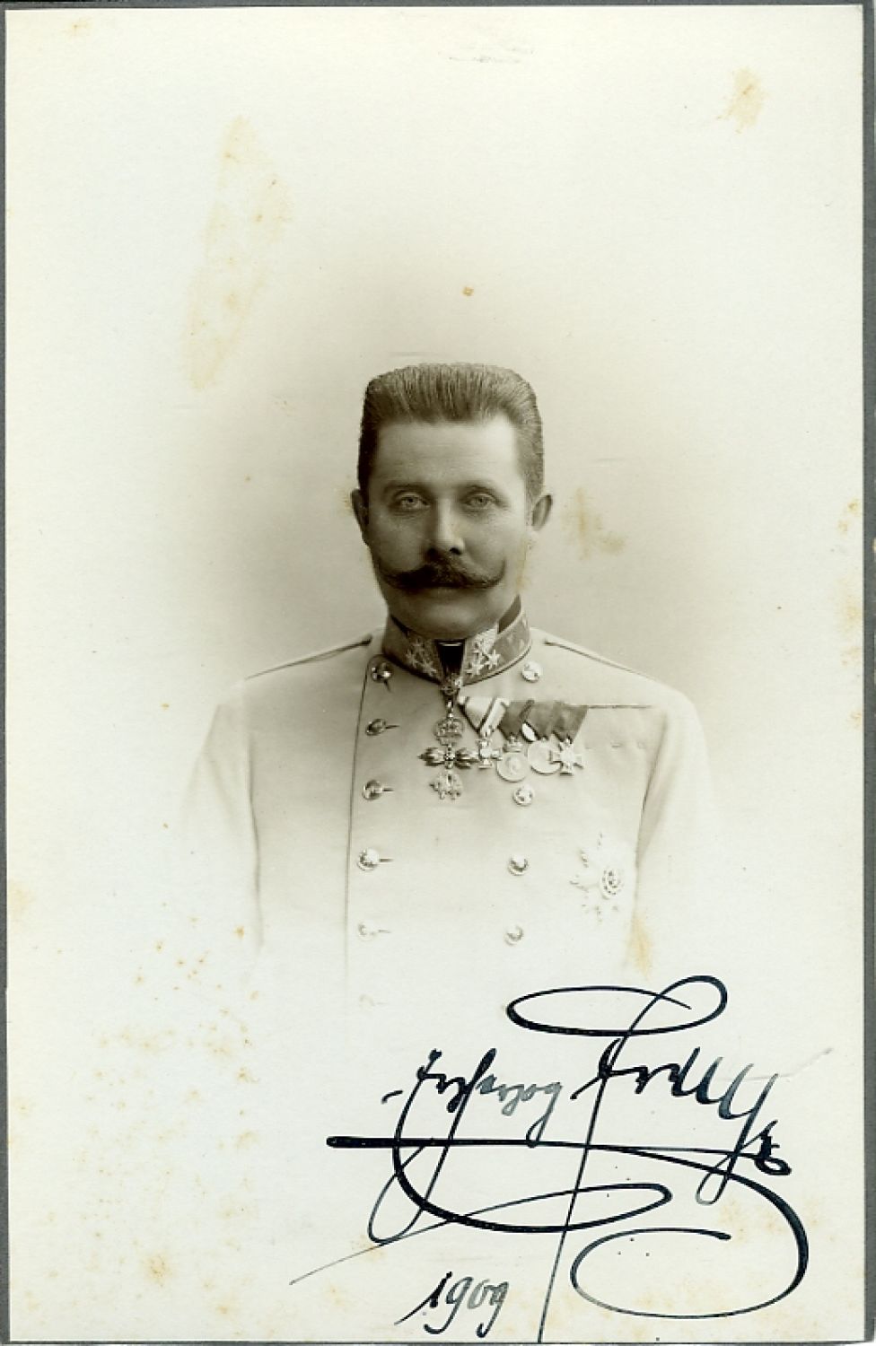 17) FRANTIŠEK FERDINAND D´ESTE (1863-1914), následník trůnu. Podpis Ferdinandův z 3.8.1892 na útržku hlavičkového papíru husarského regimentu. + Kabinetní fotoportrét z r. 1909 zhotovený vídeňským atelierem Adéle, Ferdinandem podepsaný a datovaný. + Pohlednice zhotovená po sarajevském atentátu s vyobrazením zavražděného arcivévody a vévodkyně Žofie, Vídeň, Postenverlag Brüder Kohn. + Výstřižky z dobového tisku se vztahem k atentátu.
