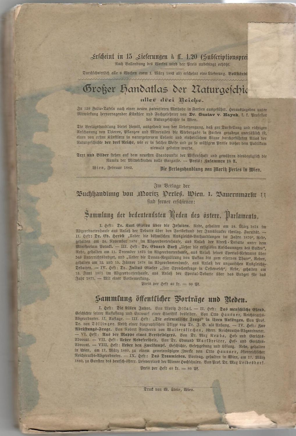 Původní brožované vydání s graficky řešenou obálkou. Obálka ohmataná a zaprášená, na hřbetu starý knihovnický štítek, na přední straně obálky a na titulní straně stará razítka ("Direktion der Brüderschule in Warnsdorf"), na zadní straně skvrny; nerozřezáno.