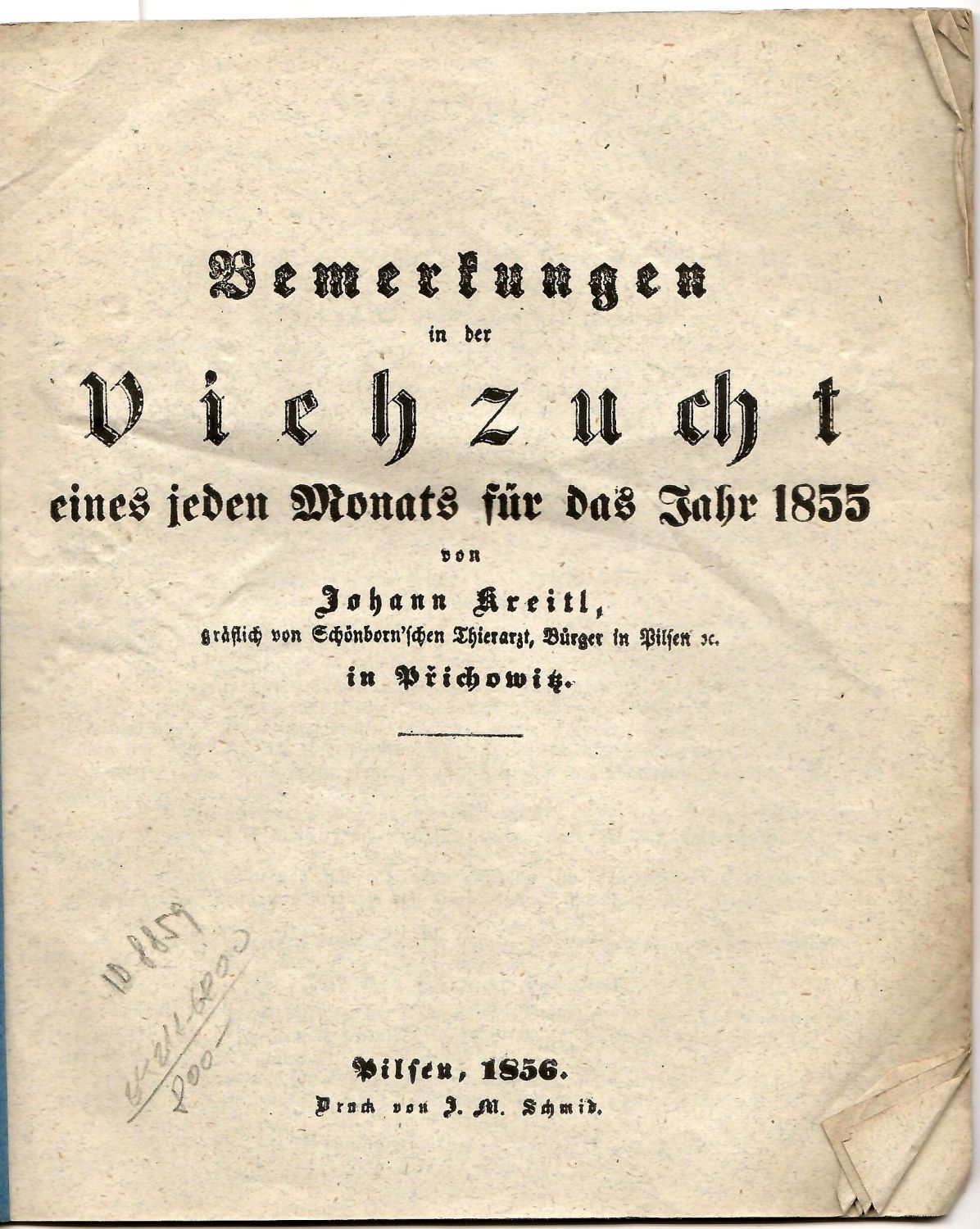 Brožura obsahuje rady jak se starat o dobytek v jednotlivých měsících roku z pera Johanna Kreitla, zvěrolékaře působícího u hraběte Schönborna a plzeňského měšťana.