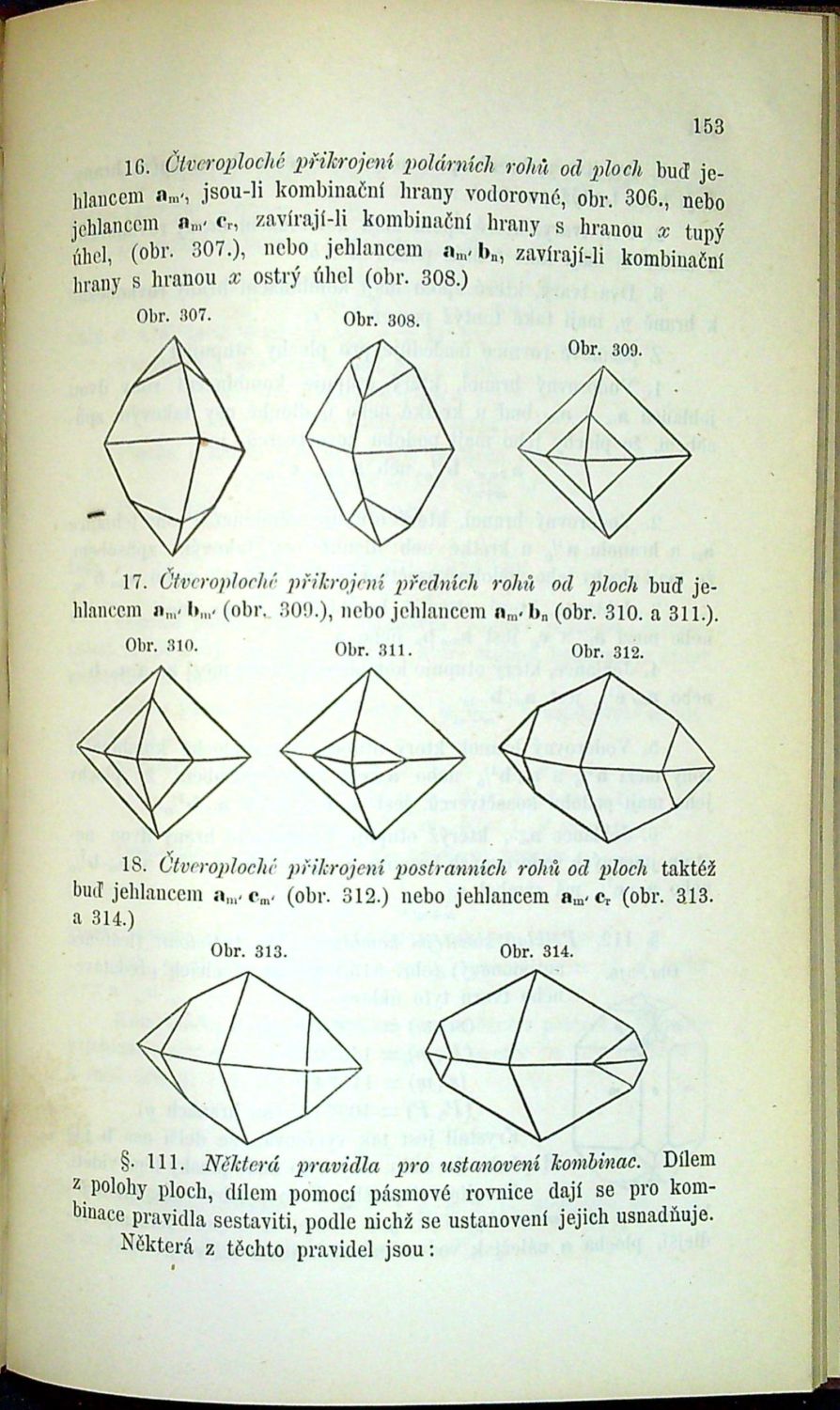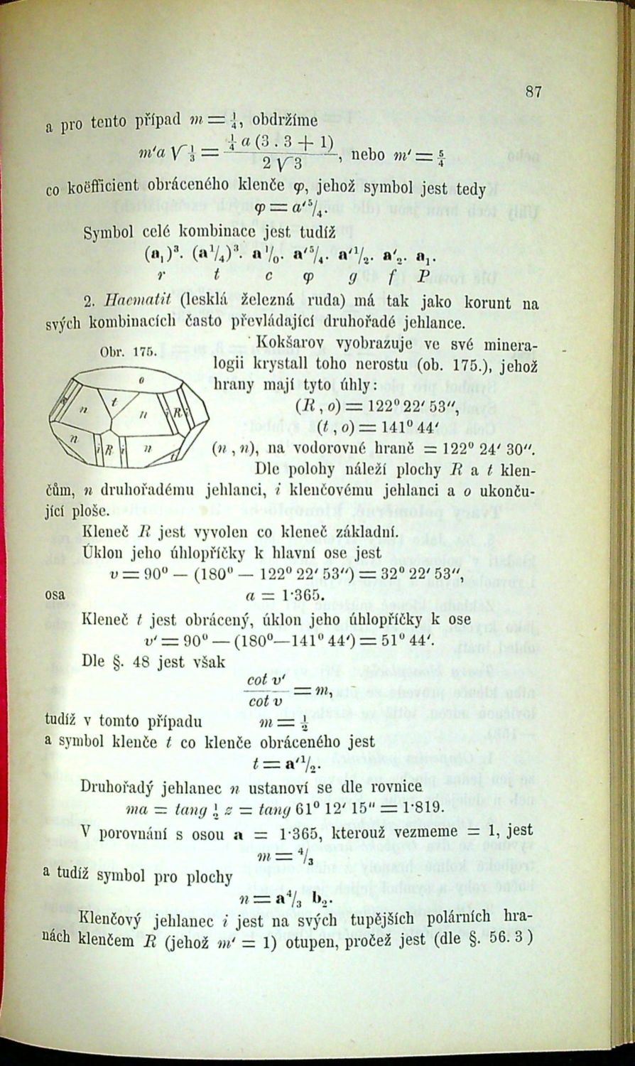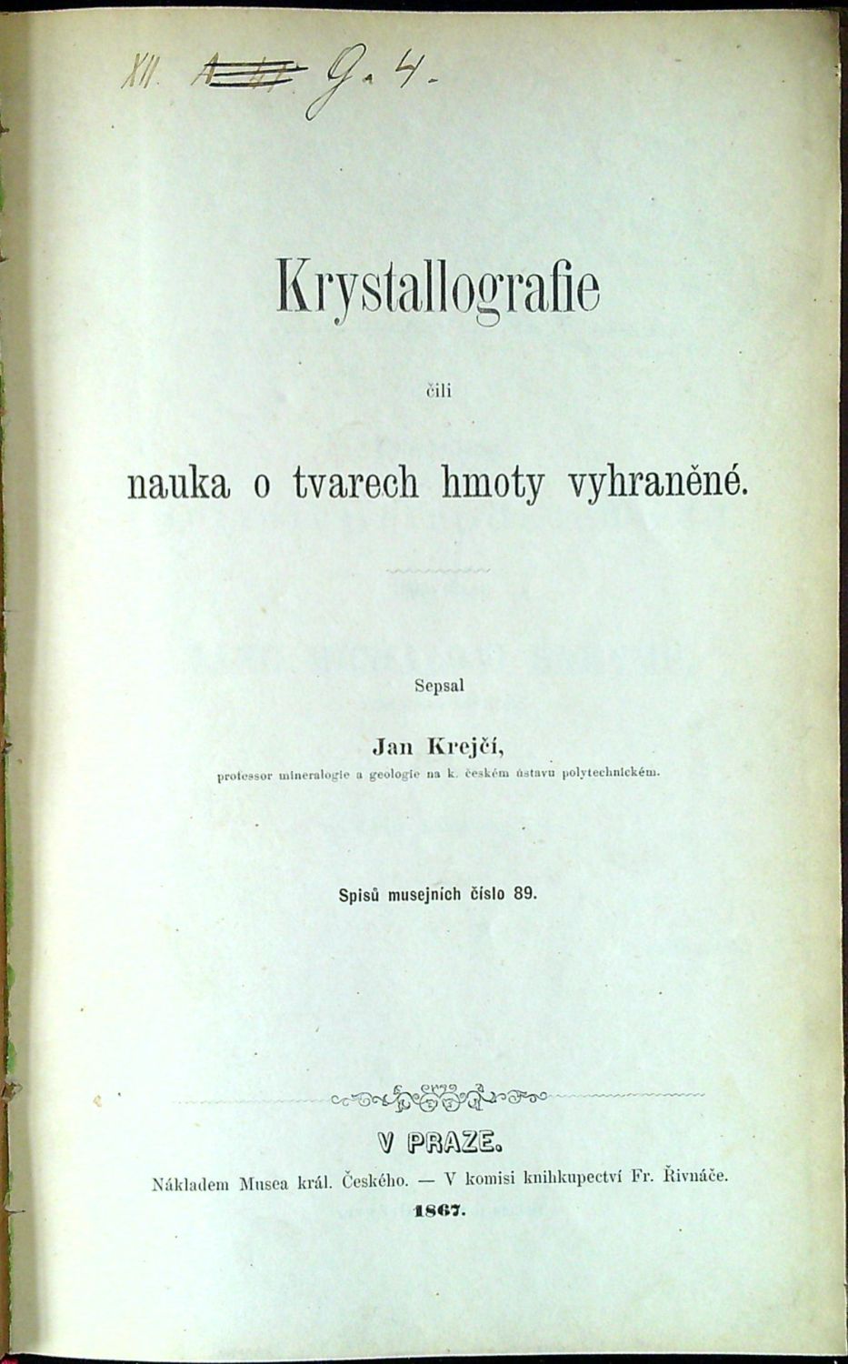 V textu řada schematických vyobrazení různých tvarů krystalů. - Původní plátěná vazba s tlačeným názvem ve hřbetu, stříkané ořízky. Při spodním okraji hřbetu torso starého pap. štítku, na stránce s tištěnou dedikací za titulním listem staré razítko "Analytické laboratorium c.k. české vysoké školy technické".
