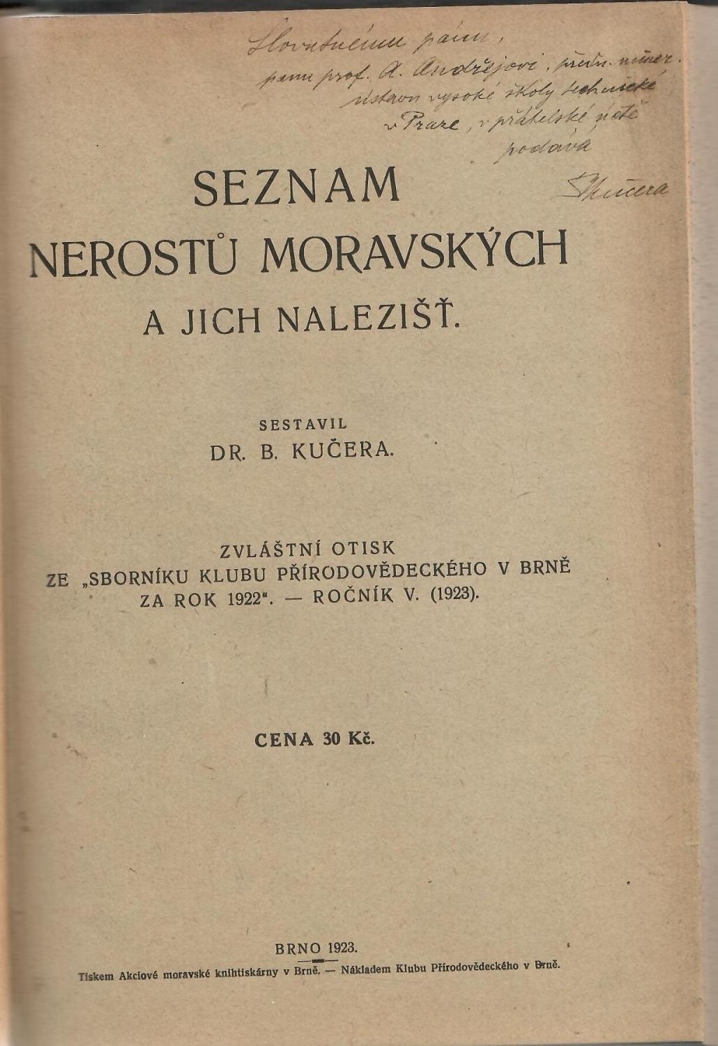 Desky potažené imitací kůže, kožený hřbet a nárožnice. Ve hřbetu 4 vazy, ve druhém poli tlačený a zlacený název, při horním i spodním jeho okraji tlačené a zlacené drobné ozdůbky. Na titulním listu rkp. dedikace autorova Prof. Dr. A. Ondřejovi. Přiloženy doplňky s "Seznamu nerostů" vydané v Brně roku 1926 - pův brožura, 13 stran