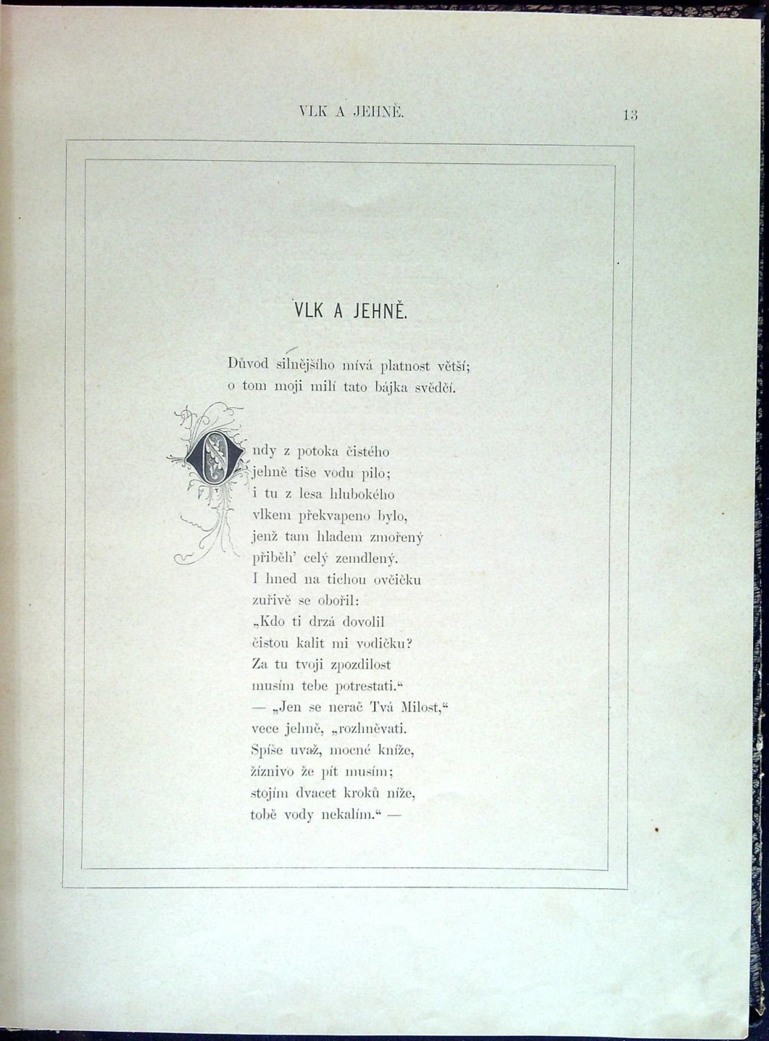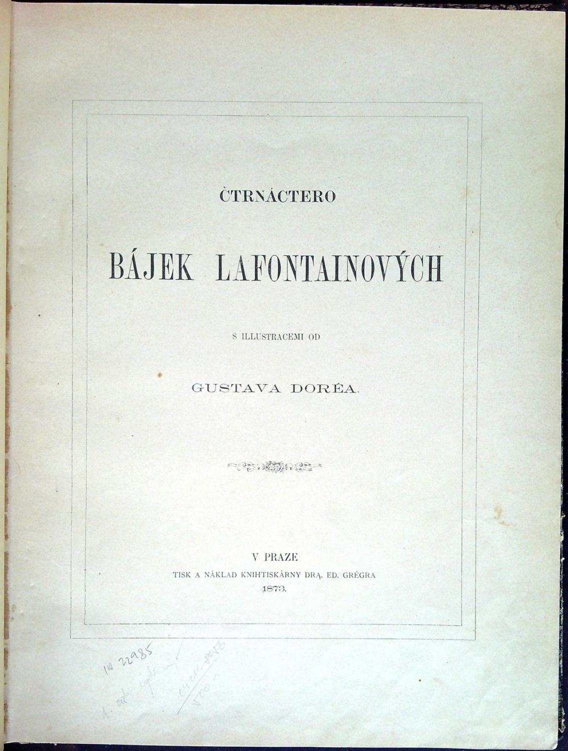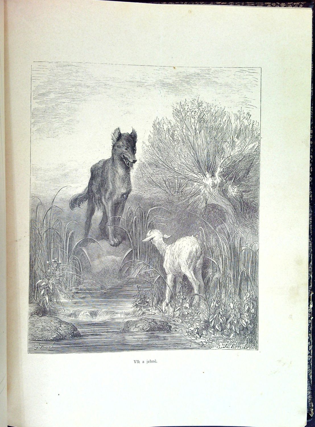 Přeložil Bedřich Peška. - Ve hřbetě tlačený věcný název (zlacení setřené), desky potažené mačkaným papírem ("hadí kůže") mírně odřené, plátěné nárožnice chybějí; list se třetí ilustrací vprostřed vertikálně přehnutý, spodní rohy průběžně lehce ohmatané, ojediněle hnědé skvrnky; názvy bajek v obsahu odškrtány modrou tužkou.