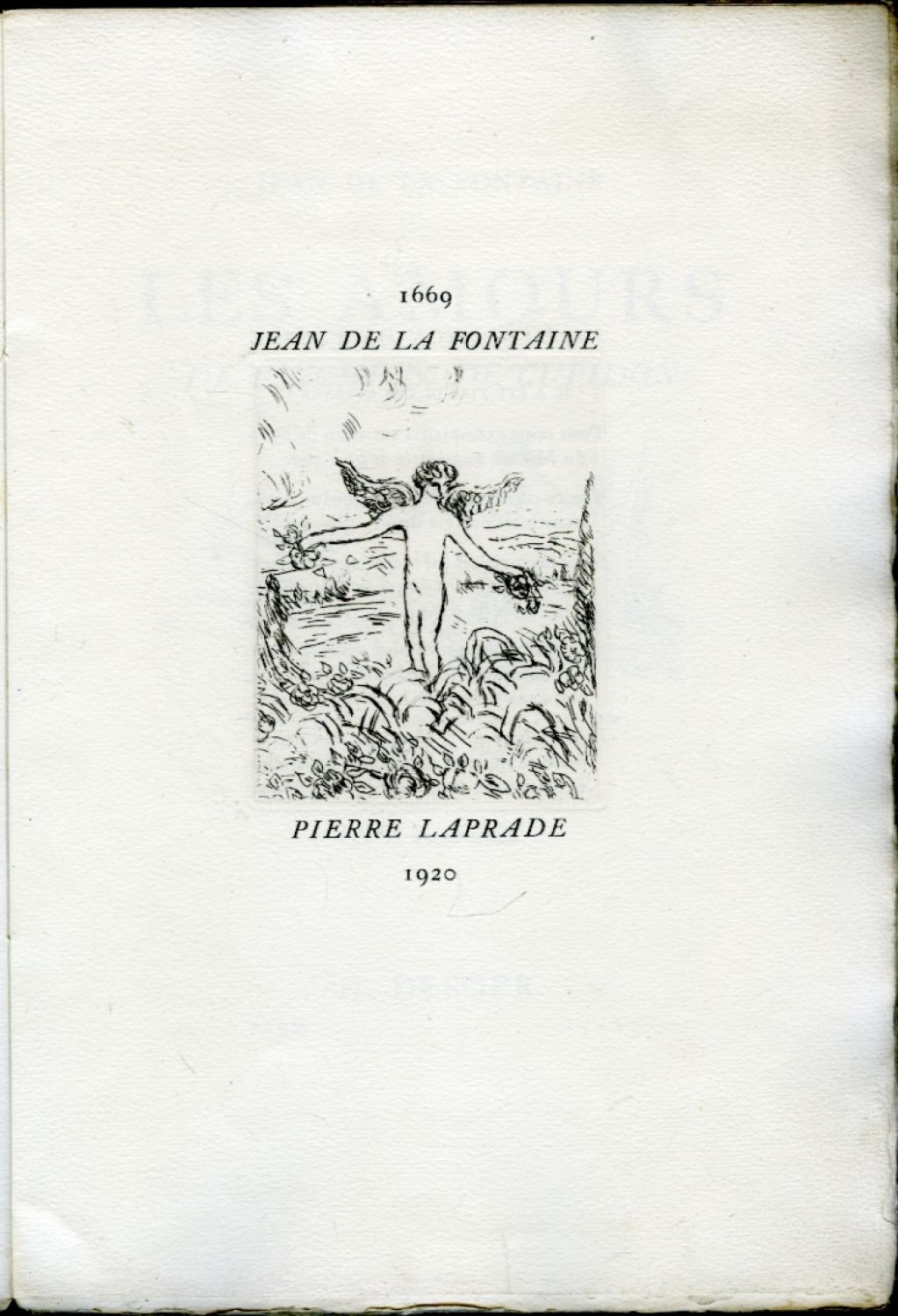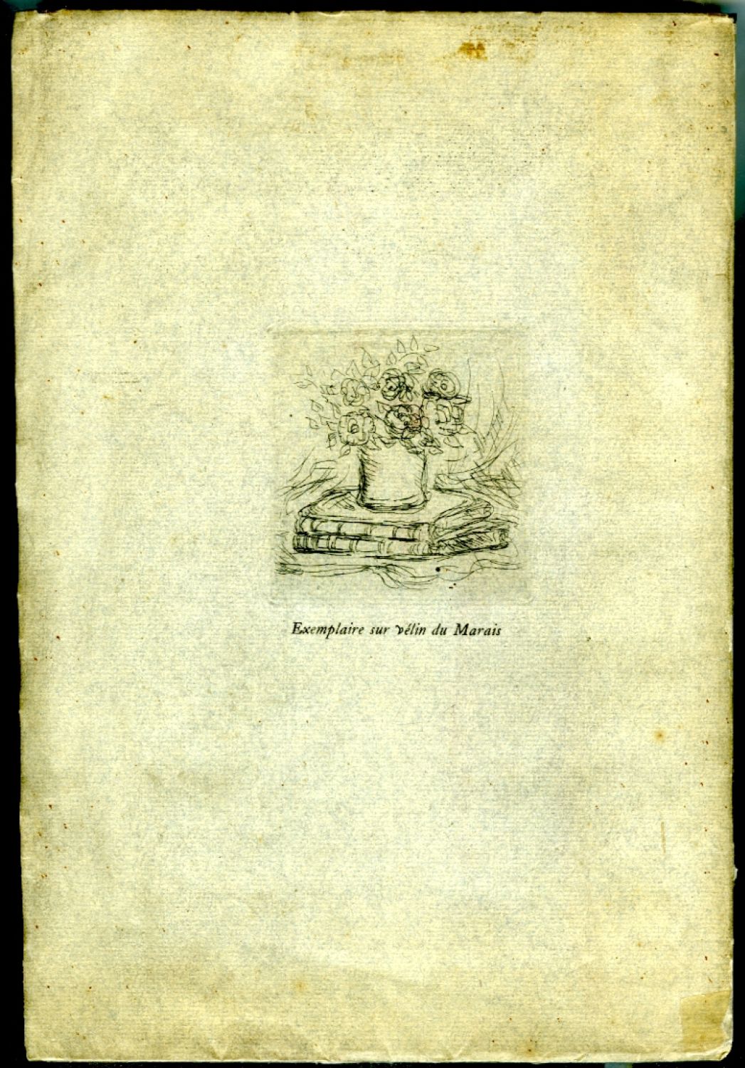Vytiskl R. Coulouma v Argenteuil v celkovém počtu 360 výt. - Ex. č. 293 ze 300 výtisků č. 61-360 na ručním velínu du Marais. Obálka zašpiněná a na okrajích mírně pomačkaná, její přední strana uvolněná a na okraji roztřepená, hřbet přelepen průhlednou páskou, knižní blok rozvolněný; listy čisté.