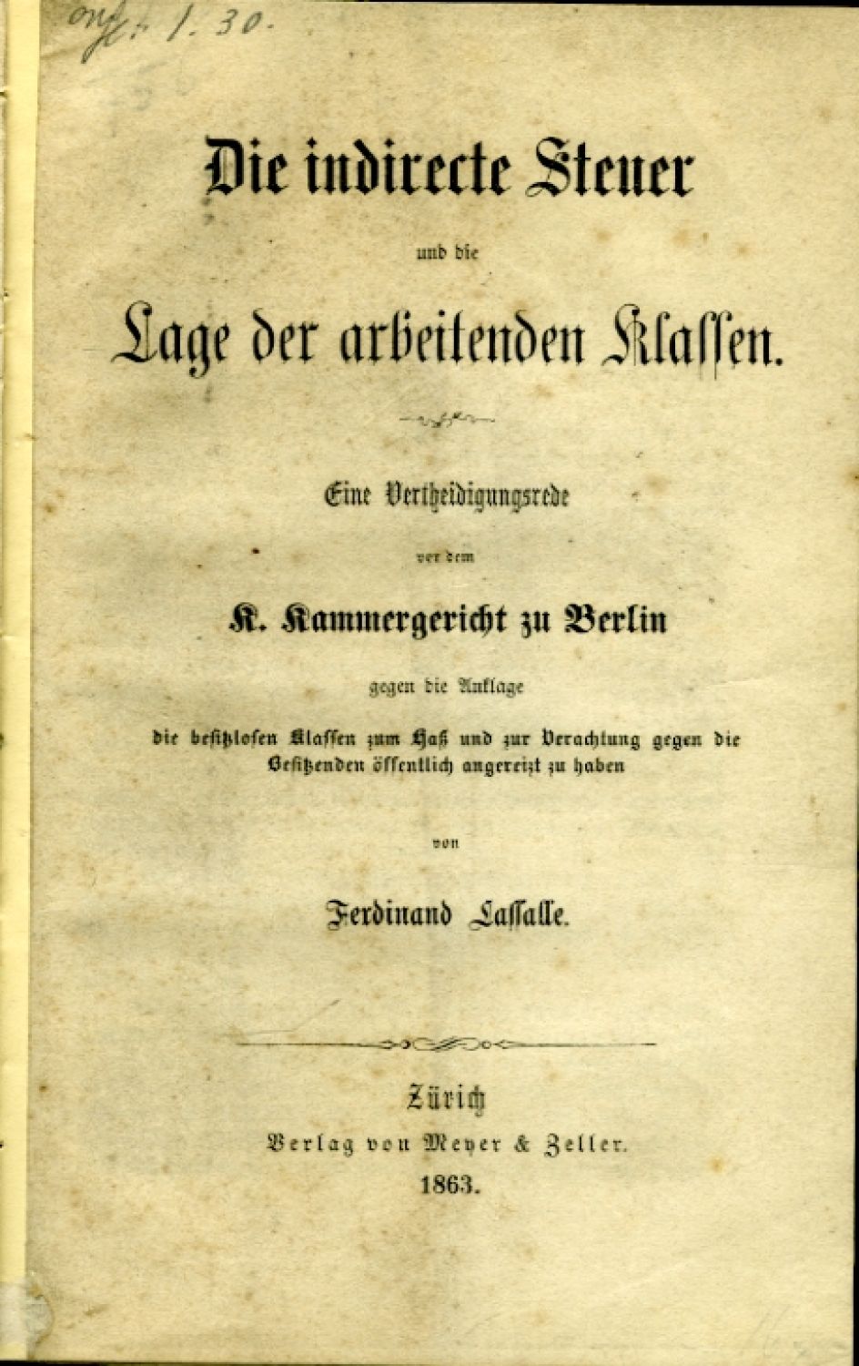 Lassalle, Ferdinand: Die indirecte Steuer und die Lage der arbeitenden Klassen. Eine Vertheidigungsrede vor dem K. Kammergericht zu Berlin gegen die Anklage die besitzlosen Klassen zum Haß und zur Verachtung gegen die Besitzenden öffentlich angereizt zu haben ... Zürich, Meyer & Zeller, 1863. 8°, (2), 136 s.