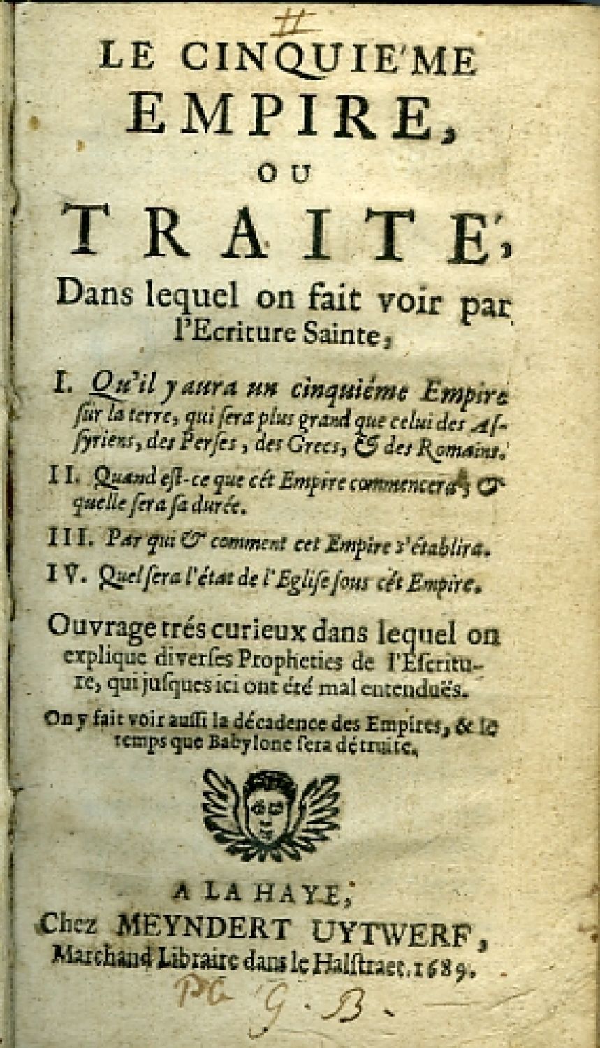 LE CINQUIEME EMPIRE OU TRAITE, Dans lequel on fait voir par l´Ecriture Sainte, I. Qu´il y aura un cinquiéme Empire sur la terre, qui sera plus grand que celui des Assyriens, des Perses, des Grecs, et des Romains. II. Quand est-ce que cét Empire commencera, et quelle sera sa durcé. III. Par qui et comment cet Empire s´établira. IV. Quel sera l´état de l´Eglise sous cét Empire. Ouvrage trés curieux dans lequel on explique diverses Propheties de l´Eferiture, qui jusques ici ont été mal entenduës. On y fait voit auffi la décadense des Empires, & Io temps que Babylone fera dé truite.
