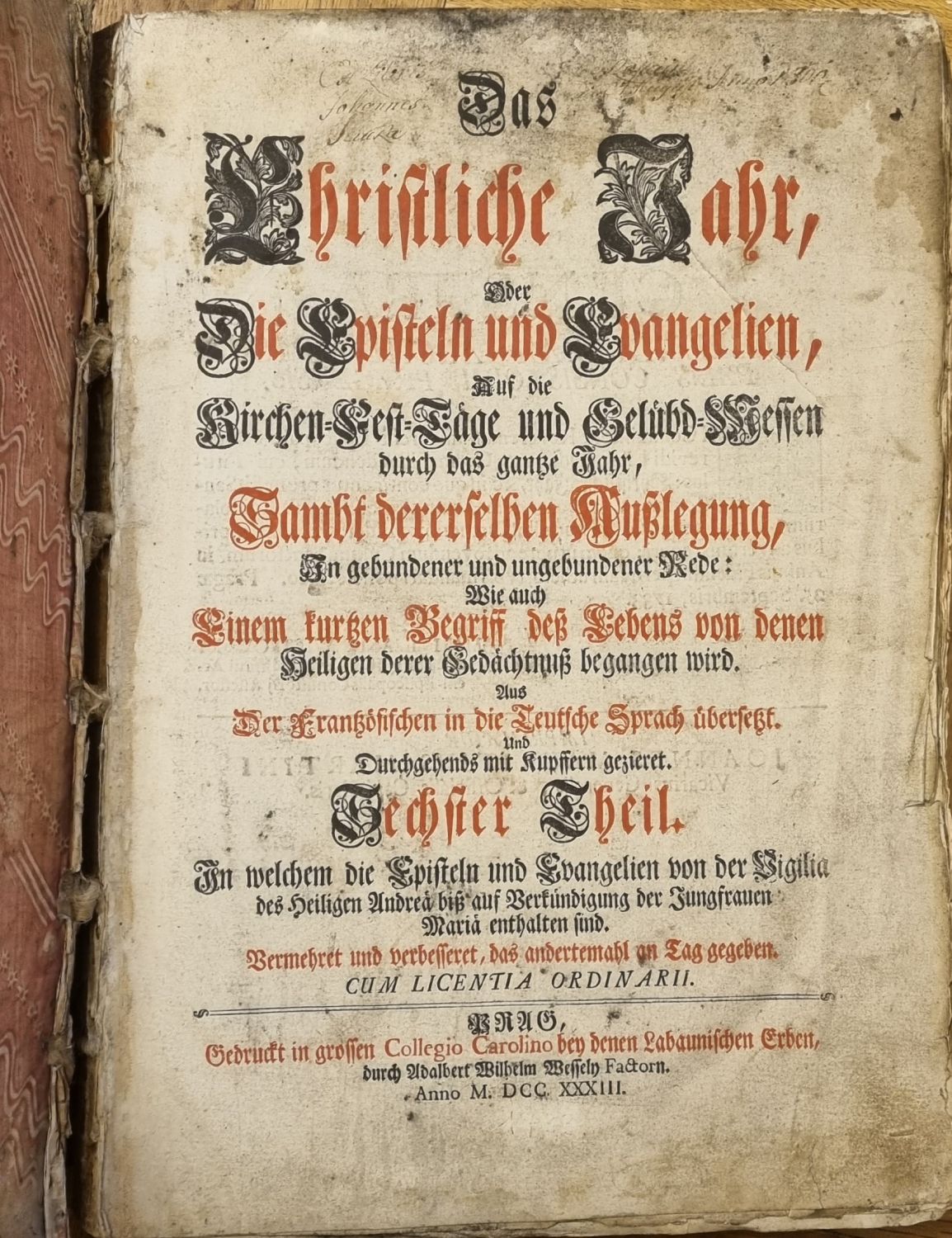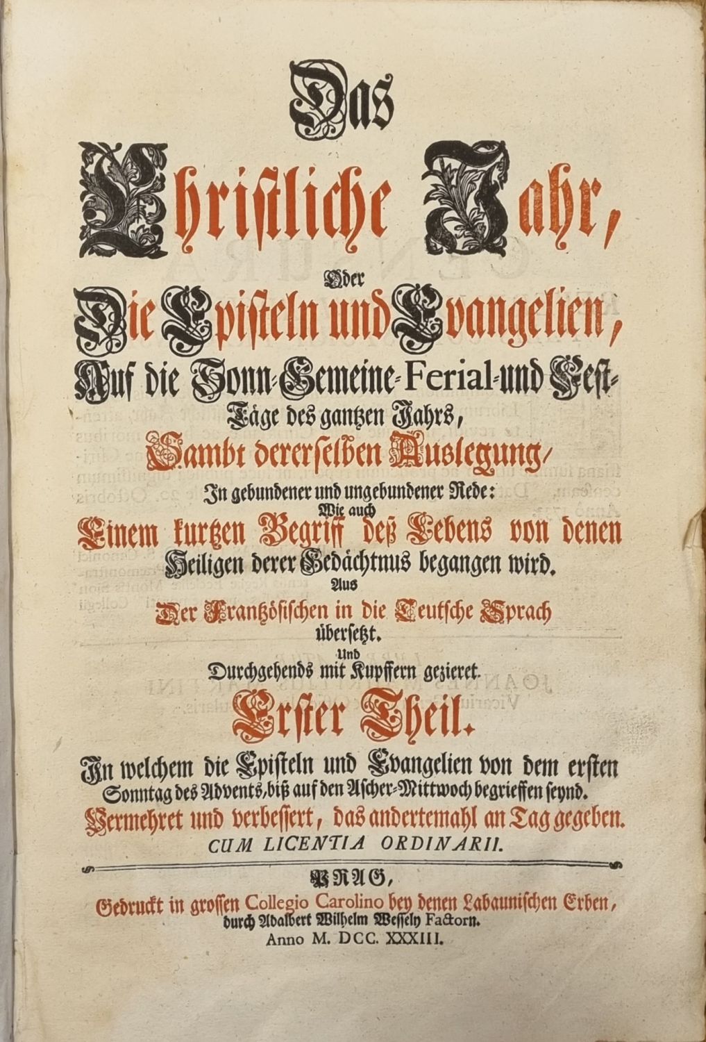 Das Christliche Jahr, oder die Episteln und Evangelien, Auf die Sonn=Gemeine=Ferial=und Fest=Tage des gantzen Jahres, Sambt dererselben Auslegung, In gebundener und ungebundener Rede: Einem kurtzen Begriff deß Lebens von denen Heiligen derer Gedächtnus gegangen wird. Aus Der Frantzösischen in die Teutsche Sprach übersetz. Und Durchgehends mit Kupffern gezieret. I.,II. Theil