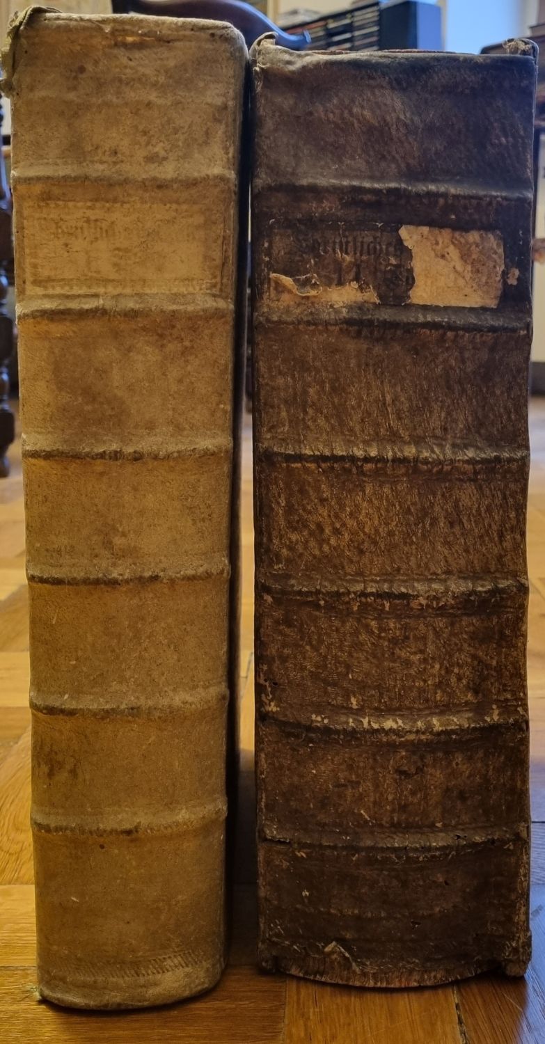 První svazek v celokožené původní vazbě ze světlé vepřovice, na obou deskách slepotiskem zdobený rám, ve hřbetu 6 vazů, barvené ořízky. Vazba ohmataná, výzdoba rámu zčásti setřená, ve druhém poli tlačený název. Druhý svazek v původní vazbě z hnědo-šedě barvené vepřovice, slepotiskem zdobený rám, ve hřbetu 6 vazů, ve druhém poli tlačený název. Vazba odřená, slepotiskem zdobená výzdoba rámů z větší části setřená, kůže při horním vnitřním okraji přední desky natržená, při spodním okraji hřbetu roztřepená, přední deska lehce uvolněná. V prvním svazku chybí frontispis, na předním přídeští rkp. vlastnický zápis "Comtesse de Zucker". První kniha ve stavu dobrém. Ve druhém svazku chybí front. s podobiznou hraběte Šporka. Titulní list svazku druhého zašpiněný, na prvních 16 stranách při okrajích výraznější skvrny způsobené vlhkostí a papír při vnějším okraji místy roztřepený. Na titulním listu nečitelný proven. přípis z 18. století.