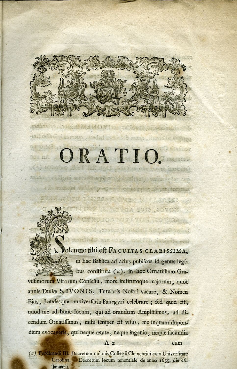 MAGNUS JURIS & JUSTITIAE SACERDOS, ET MISSERABILIUM PERSONARUM ADVOCATUS SANCTUS IVO A CLARISSIMA FACULTATE JURIDICA CORAM SENATU, POPULOQUE ACCADEMICO ANNIVERSARIA PANEGYRI CELEBRATUS, IN Basilica B. V. in Coelos Assumptae ante curiam laetam Palaeo - Pragae ORATORE PRAENOBILI, ac DOCTISSIMO ....