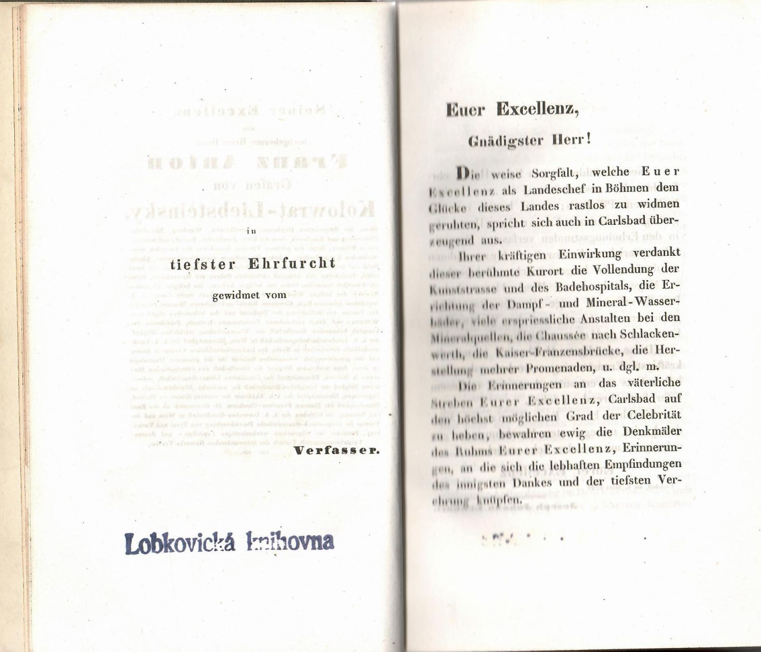 Antikva, tištěné poznámky po stranách a pod čarou. Ve front. ocelorytina s pohledem na Karlovy Vary, kterou podle kresby V. Morstadta vyryl A. Rybička, na konci rozkládací ocelorytina se schematickým průřezem lázeňské budovy.