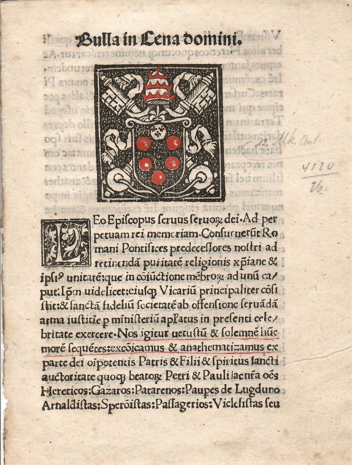 Ilustrace:Na tit. listu zčásti kolorovaný dřevoryt ve dvojitém jednoduchém rámečku (53 x 50 mm) s vyobrazením znaku biskupa Lea z rodu Medicejských a pozdějšího papeže Lea X.