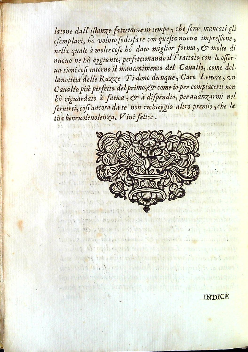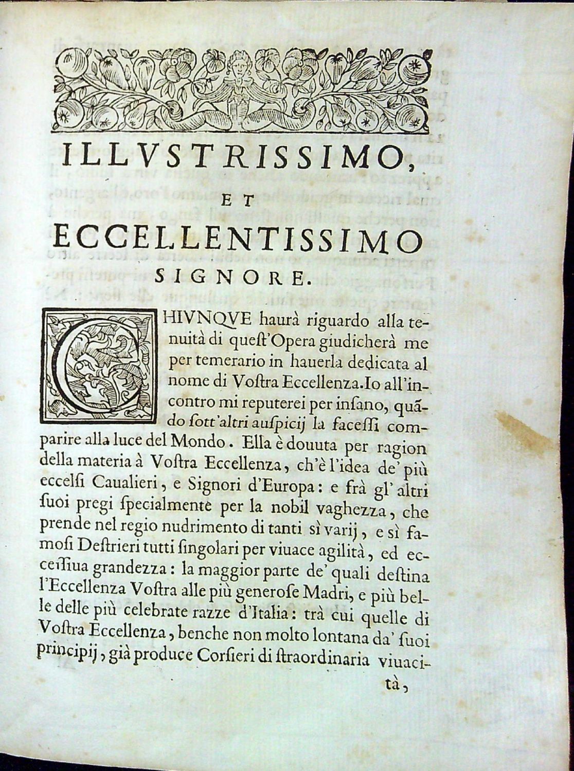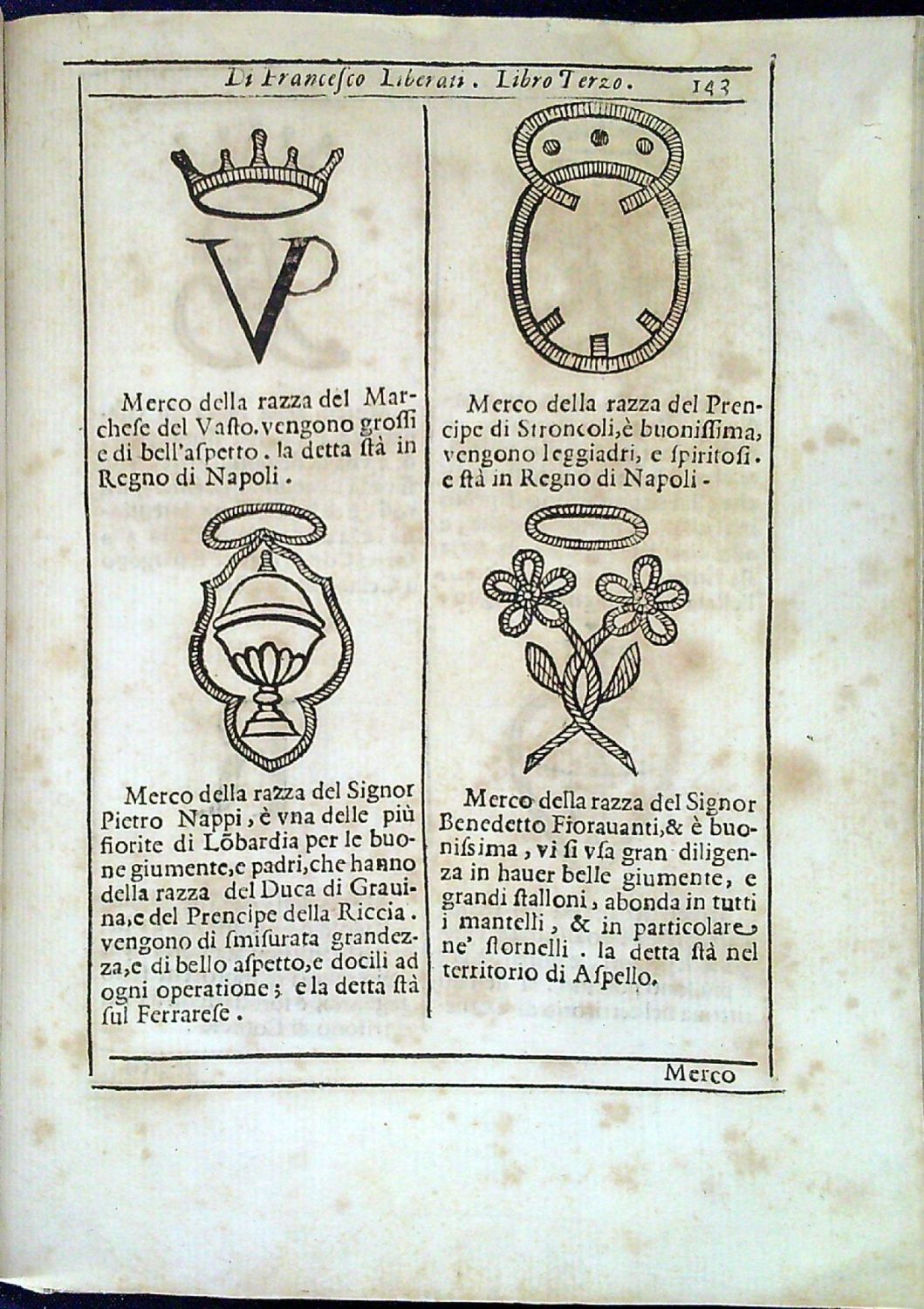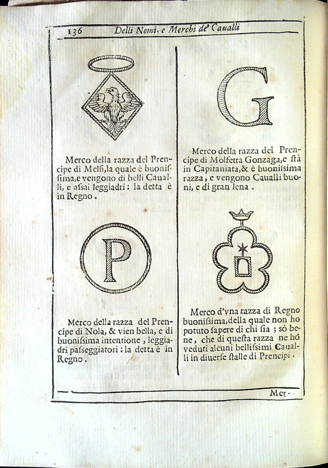Na tit. listu erb Gio. Battisti Borghese, II. prince ze Sulmony, kterému je kniha dedikována. Konturové iniciály ve dvojitém jednoduchém rámečku na rostlinném pozadí zalomené do výše 5-6 řádků, tučně tištěné versálky ve výši 2 řádků, vstupní pásový vlys, rostlinné viněty a koncová s koněm a psem v rostlinné kompozici, na straně 133-223 celkem 355 dřevořezových vyobrazení erbů a znaků chovatelů a majitelů různých druhů koní s uvedením jejich titulů, jmen a názvů plemen jimi vlastněných.