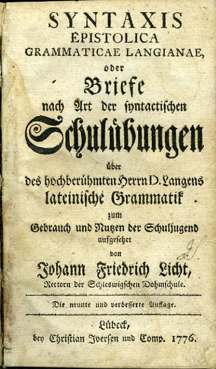 SYNTAXIS EPISTOLICA GRAMMATICAE LANGIANAE, oder Briefe nach Art der syntactischen Schulübungen über des hochberühmten Herren D. Langens lateinische Grammatik zum Gebrauch und Nutzen der Schuljugend aufgesetzet von ... Rectorn der Schleswigschen Dohmschule. Die neunte und verbesserte Auflage.