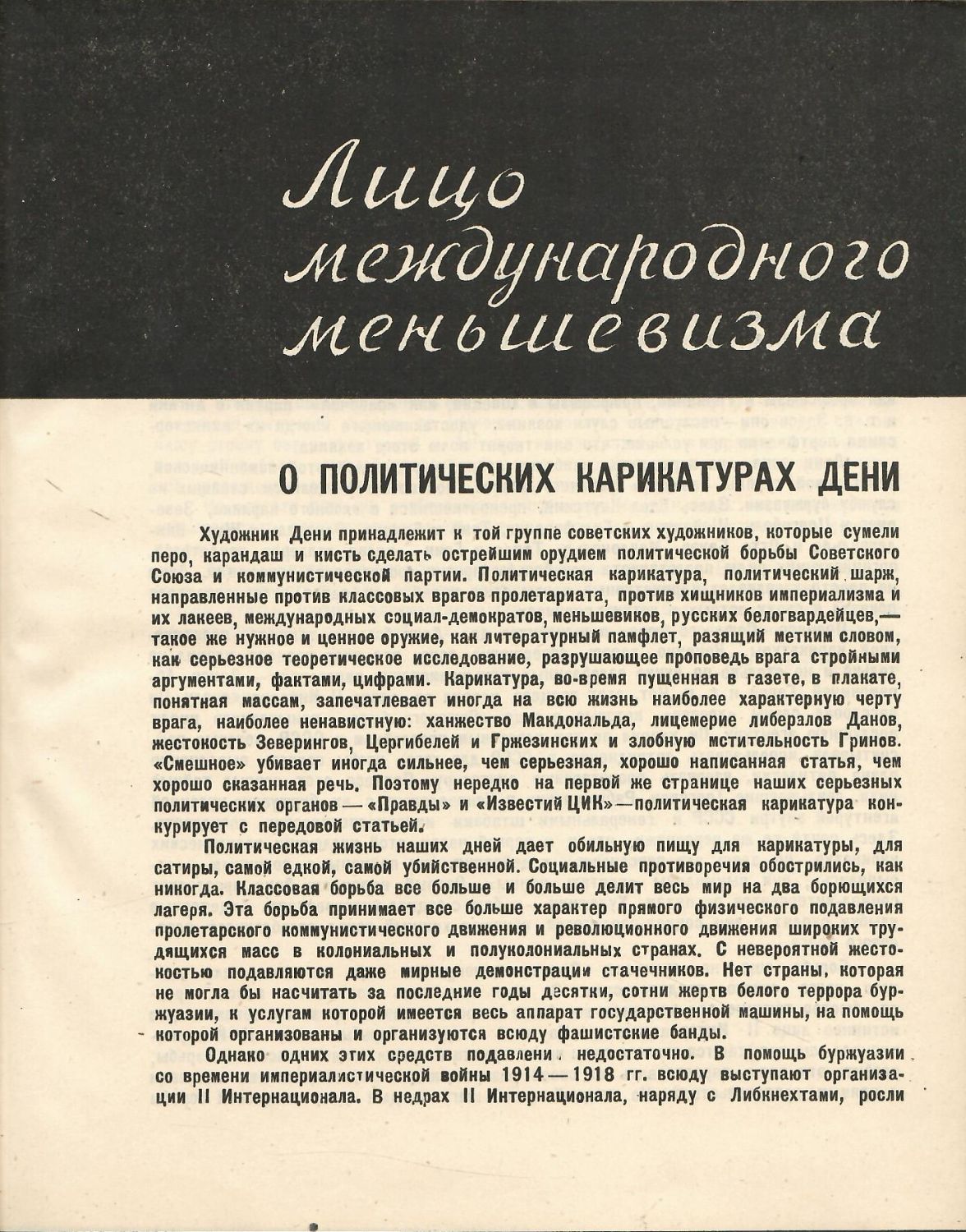 Úvodním slovem opatřil Em. Jaroslavskij, na posledních dvou listech komentář k oddílu I-IV. Kniha se skládá ze čtyř částí od sebe oddělených listy s vyznačením části a názvem. I. část "Chozjain i ego vysokooplačivaemye specialisty" - oddíl tištěný na světle žlutém papíře se 16 karikaturami různých, sovětskými komunisty nenáviděných osobností marxistického vyznání (Karl Kautsky, Otto Bauer, van der Velde, Paul Boncour, Rudolf Hilferding,... též je mezi nimi zařazen britský politik MacDonald). 2. část "Agentura interventov" tištěná na světle béžovém papíře se 13 karikaturami různých osobností z menševického prostředí usilujících a pád komunistické diktatury. 3. část "S.-d. za rabotoj" tištěná na světlém béžovém papíře s 21 karikaturami největšího nepřítele "sovětského ráje" sociální demokracie (mnohdy s fašistickými symboly) - poslední karikatura rozkládací a zčásti barevná. 4. část "Otvet interventam" s třemi (dvě z nich částečně barevné a rozkládací) ilustracemi zobrazujícími sílu sovětského režimu. - Kniha vyšla pod redakcí A. A. Antonova. V duchu konstruktivismu upravený titulní list a listy uvozující jednotlivé oddíly.