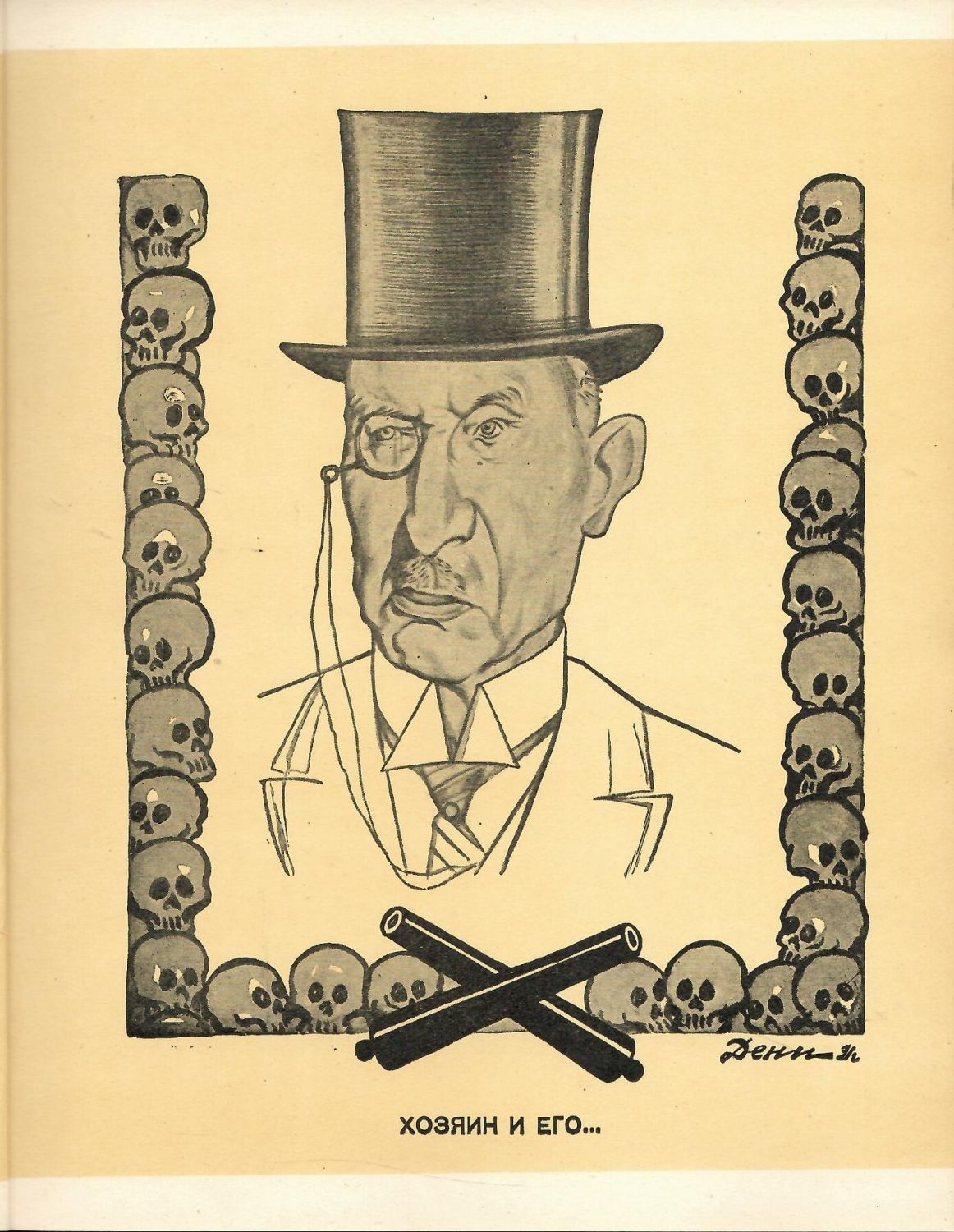 Původní poloplátěná vazba, na přední desce na kartonu barevná karikatura Deniho, při horním okraji plátna vytlačené jméno ilustrátora, při spodním značka a jméno nakladatelství, na desce zadní na kartonu barevná ilustrace symbolizující rudou frontu, která se nikdy nepokoří.