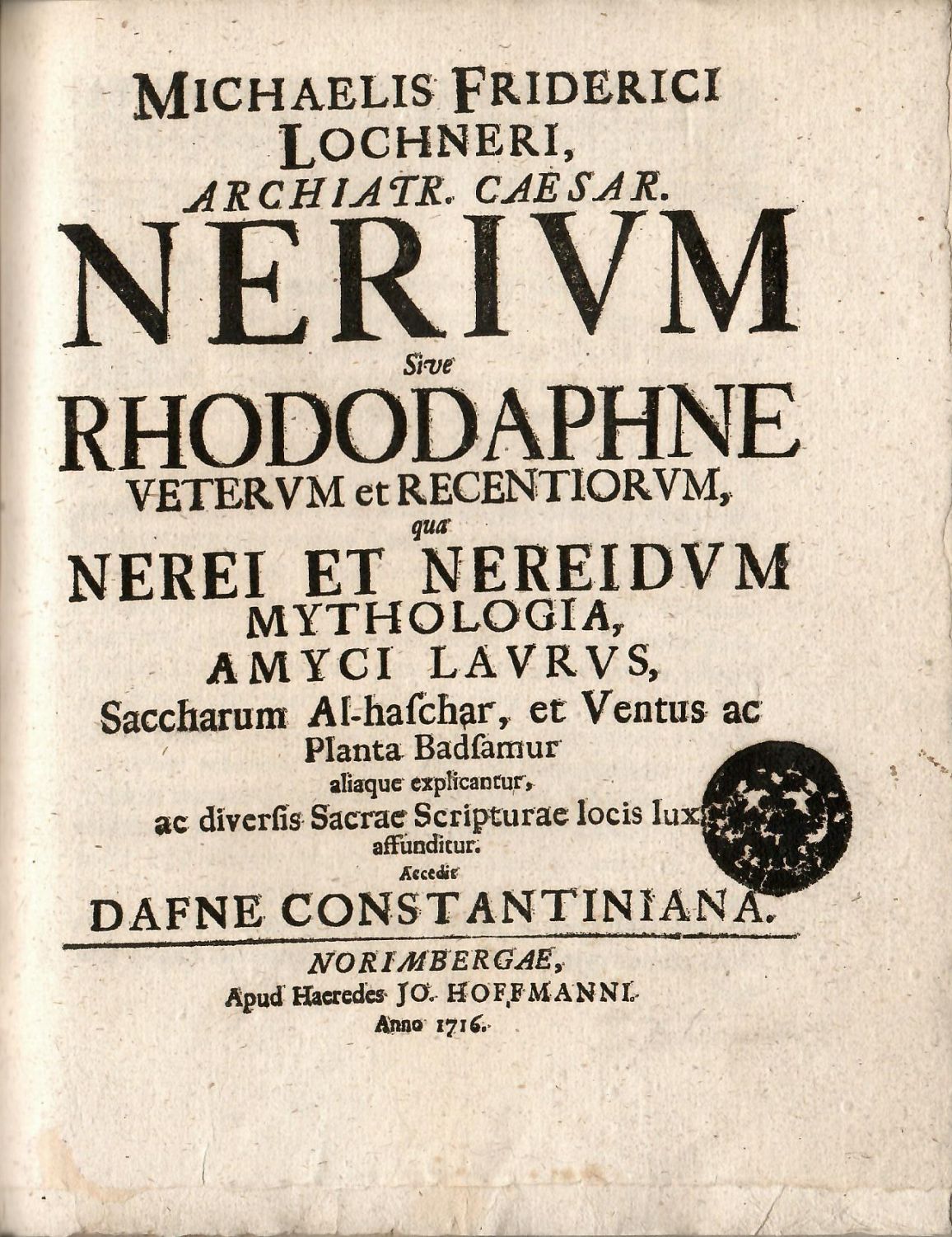 MICHAELIS FREDERICI LOCHNERI, ARCHIATR. CAESAR. NERIVM Sive RHODODAPHNE VETERVM et RECENTIORVM, qua NEREI ET NEREIDVM MYTHOLOLOGIA AMYCI LAVRUS, Saccharum Al-haschar, et Ventus ac Planta Badsamur alique explicantur, ac divesrsis Sacrae Scripturae locis lux affunditur. Aecedit DAFNE CONSTANTINIANA.