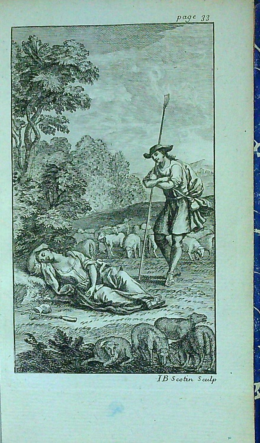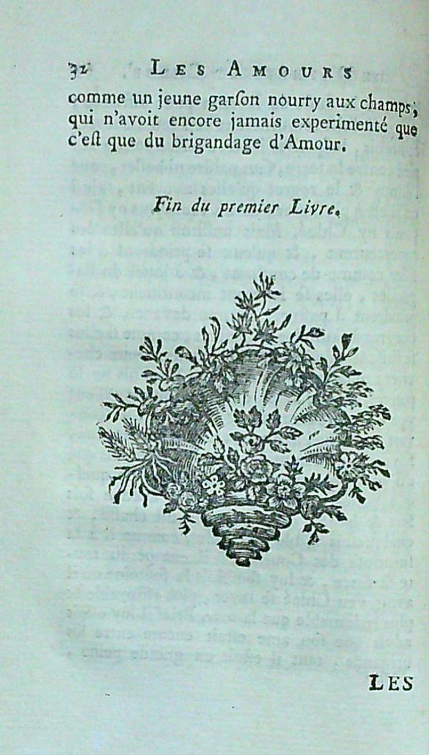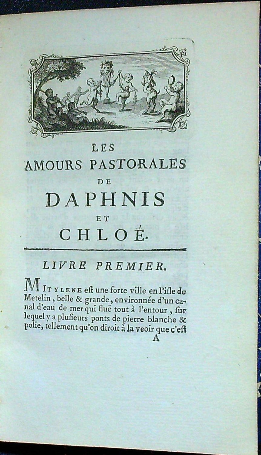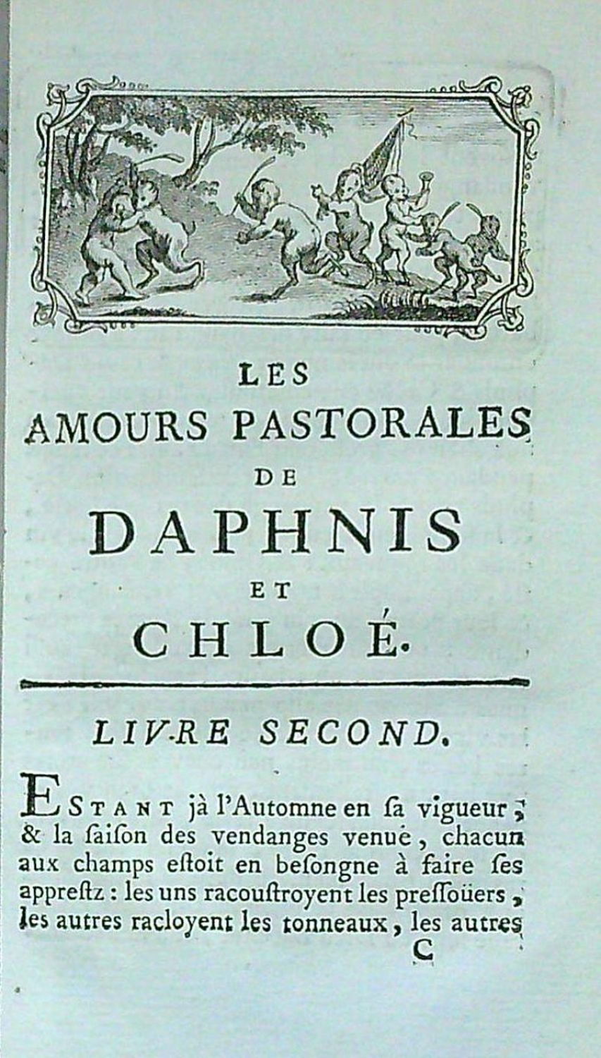 Červeno-černě tištěný titulní list s mědirytinovou vinětou, ve frontipisu mědirytina se zakomponovaným názvem knihy, v textu 8 celostr. mědirytin od J. B. Scotina (z toho 4 jsou autorem v desce signované), 4 mědirytinové viněty nad začátkem každé knihy, v jejich závěru dřevořezové viněty, živá záhlaví. Z řeckého jazyka do francouzštiny přeložil J. Amyot.