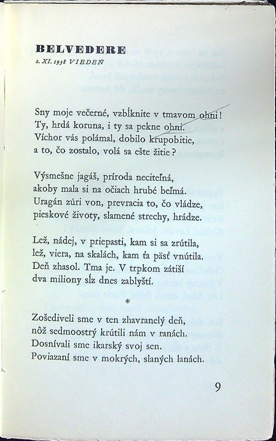 Ex. č. 254 z 2200 vydaných a čísl. výtisků, které písmem Garamond na japonský Banzay vytiskla Česko-slovenská grafická Unie v Praze a Prešově. Dvoubarevně tištěný tit. list. - Původní obálka na přední straně při horním okraji ve výši cca 1 cm natržená.