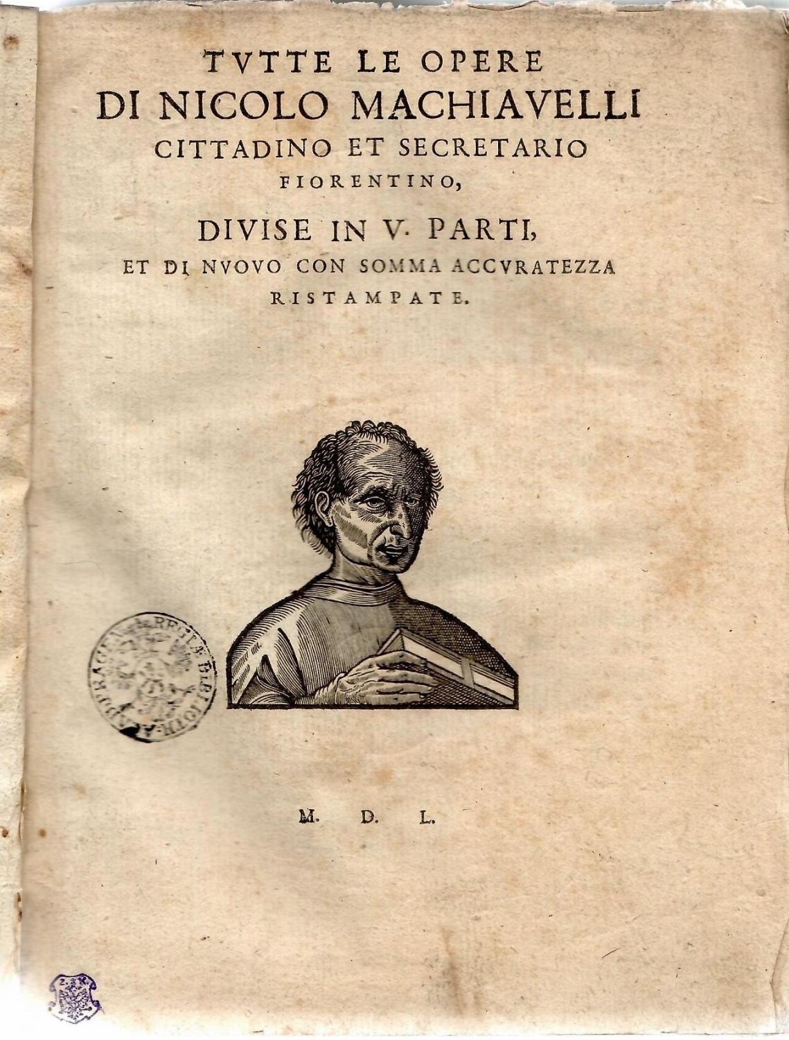 TVTTE LE OPERE DI NICOLO MACHIAVELLI CITTADINO ET SECRETARIO FIORENTINO, DIVISE IN V. PARTI, ET DI NVOVO CON SOMMA ACCVRATEZZA RISTAMPATE.