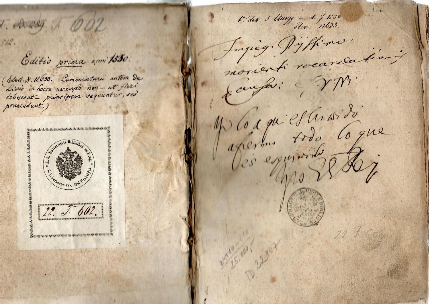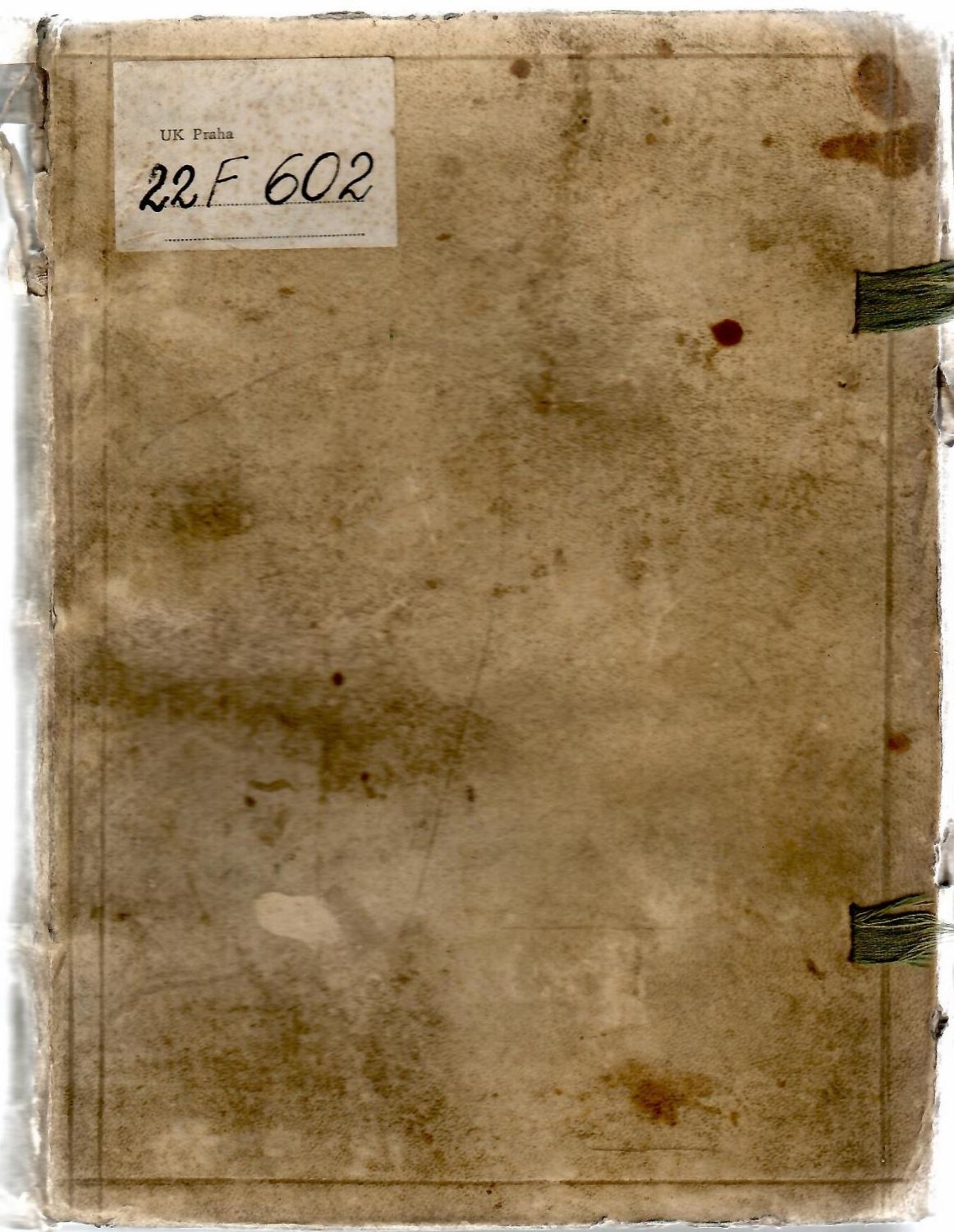 Dobová pergamenová vazba s tlačeným jednoduchým rámem z jednoduchých linek, při hřbetu zdvojených, na obou deskách torsa dvou párů vázacích tkanic, barvené ořízky, ve hřbetu 3 vazy. Vazba ohmataná a zašpiněná, první pole hřbetu potrhané, chybí kus pergamen. pokryvu, při horním okraji hřbetu proužek makulatury na pergamenu s oboustranným torsem rukopisu z konce 14. či první půle 15. století. Ve druhém poli hřbetu torso pap. štítku z 19. století, v poli spodním inkoustem napsané evidenční číslo, na přední desce vazby pap. štítek z první půle 20. století "UK Praha", na předním přídeští nalepeno ex libris z 19. století s evidenčním číslem "K.K. Universitätis Bibliothek zu Prag" (všechny evidenční čísla jsou stejná), na přední předsádce a na titulním listu razítko stejné knihovny z konce 19. století. Na předním přídeští nad nalepeným ex libris perem psaný rukopis v latinském jazyce s mylnými bibliografickými údaji o vydání knihy, na přední předsádce perem v němčině stejně chybná datace tisku a odvolání na bibliograf. číslo v Ebertově Lexikonu, pod ní starší latinský přípis. Při spodním levém okraji titulního listu starší vlastnické razítko v podobě štítu s orlicí a iniciálami Z.K. Papír zahnědlý, místy hnědé skvrny a skvrnky. Kniha byla zakoupena z pozůstalosti po významném knihařovi Jendovi Rajmanovi (1892-1965) z Rožďalovic, který knihu získal do své sbírky před druhou válkou světovou.
