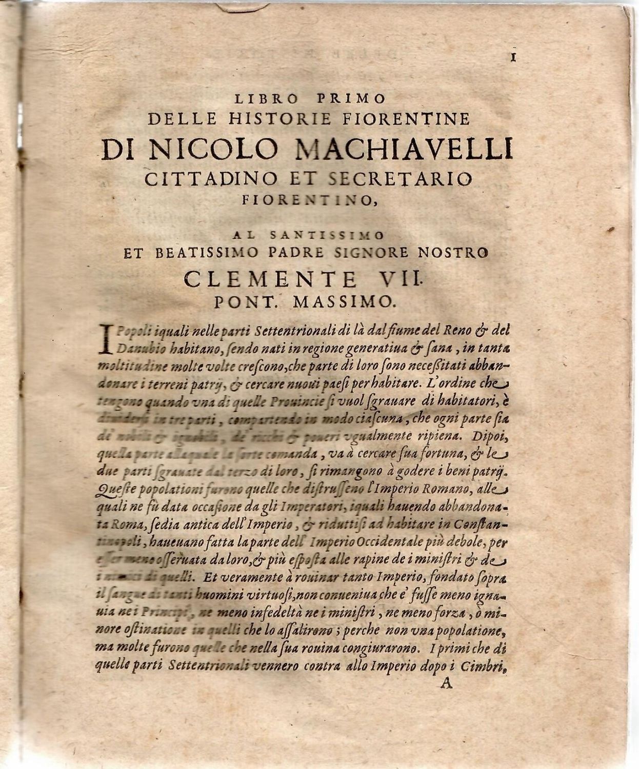 Na titulním listu dřevoryt s vyobrazením Machiavelliho, živá záhlaví, tučně tištěné versálky ve výši 2 řádků. Kniha se skládá z pěti částí, v nabízeném exempláři jsou 2. a 3. část přehozené, každá je opatřena titulním listem bez uvedení místa tisku a tiskaře, na části první uvedena záměrně falešná datace tisku.