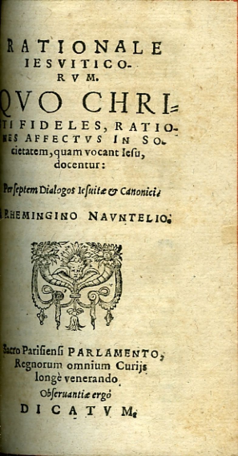 přívazek: Nauntelius, Rhemigius: RATIONALE IESVITICORVM. QVO CHRISTI FIDELES, RATIONES AFFECTVS IN SOcietatem, quam vocant Iesu, docentur: Per septem Dialogos Iesuitae et Canonici, á RHEMINGINO NAVNTELIO. Dantisci (Gdańsk), Gerardus Pessus, 1595, [LXIV]-155-[III], listy folia )(7,8 nepotištěné, poslední strana (rub impresa čistá), na tit. listu a v impresu viněty, živá záhlaví, iniciály na ornamentálním pozadí ve výši 4-5 řádků, pásový vstupní vlys, v textu versálkami tištěné označení disputujících (kanovníka a jezuity). V NK ČR je evidovaný exemplář stejného vydání, který se však liší typologicky, sazbou, vinětami a iniciálami.
