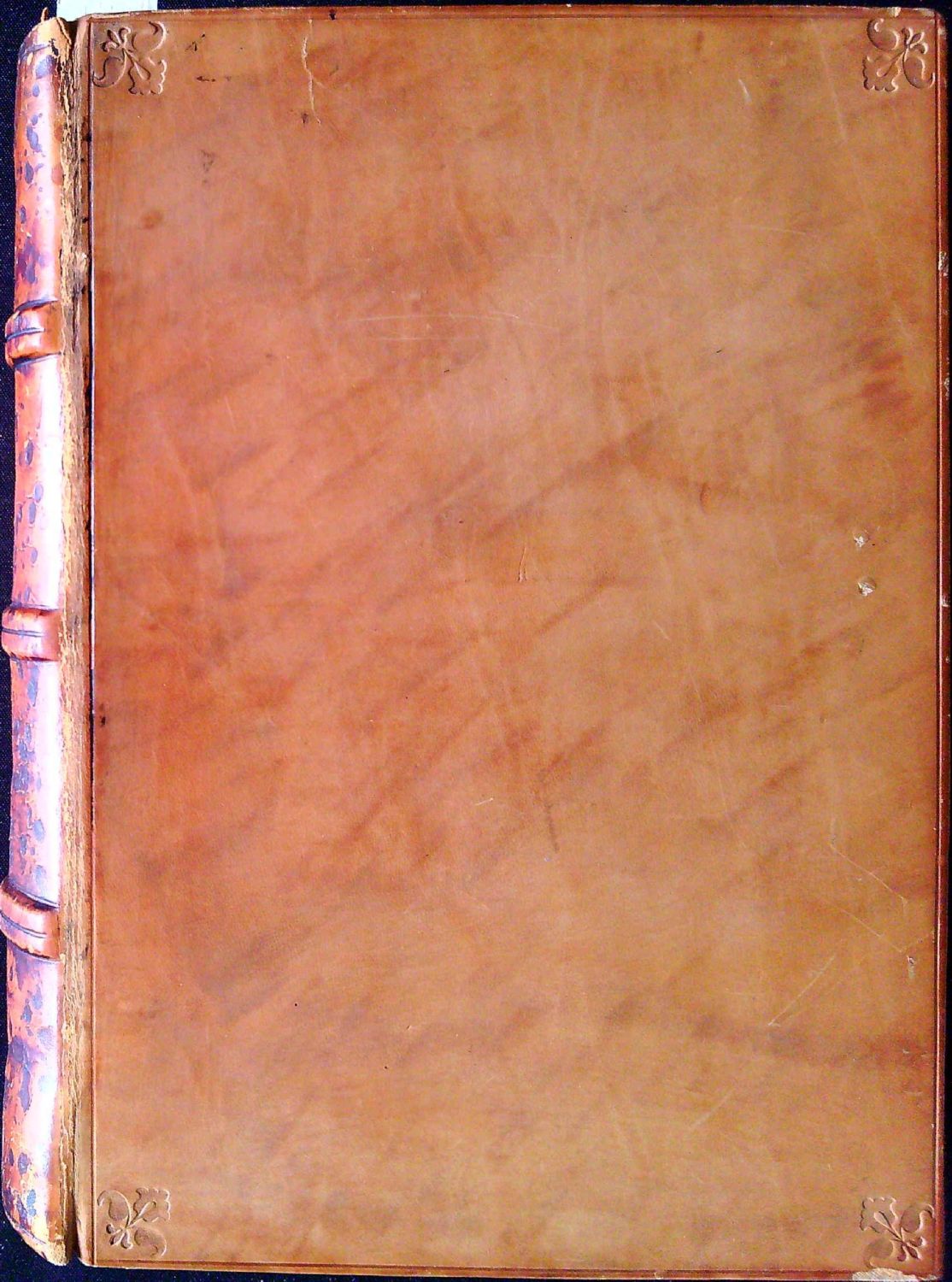 Vazba z první poloviny 20. století, dřevěné desky potažené světlou teletinou, v rozích obou desek tlačený rostlinný ornament, na zadní desce uprostřed v kulatém medailonu nápis "BUR LAMAC CHI" (knihvazač, vlastník ?), ve hřbetu kůže barvená s černými záměrně knihařem vytlačenými nepravidelně rozmístěnými flíčky, tři vazy, v jednotlivých polích tlačený rostlinný ornament. Rozměr vazby 245 x 180 mm. Na několika listech při spodním okraji světlé, nikterak rušící mapy. Široké okraje, ve stavu velmi dobrém. Kompletní exemplář.