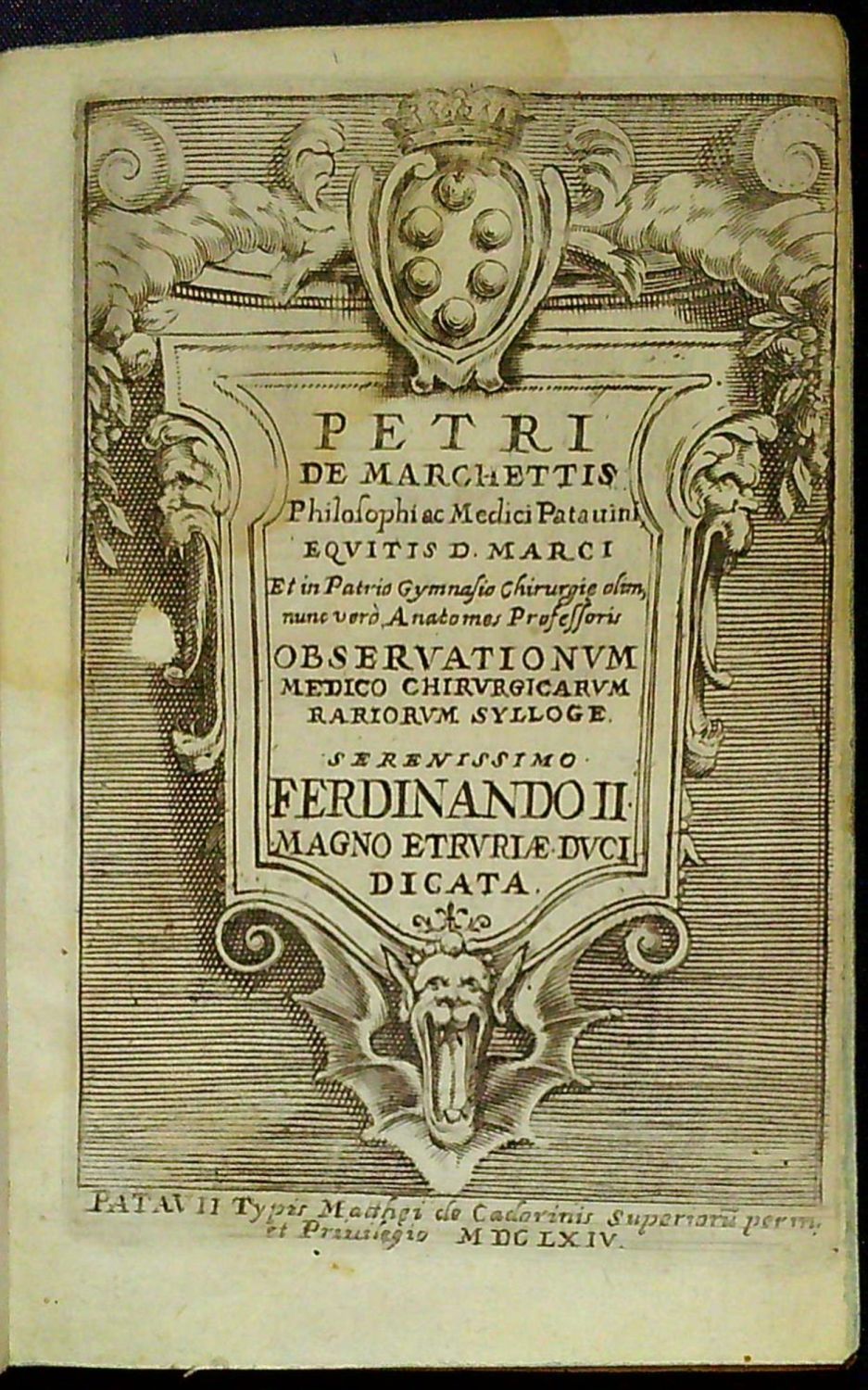 PETRI DE MARCHETTIS Philosophi ac Medici Patauini, EQUITIS D. MARCI Et in Patrio Gymnasio Chirurgiae olim, nunc vero Anatomes Professoris OBSEVATIONUM MEDICO-CHIRURGICARUM RARIORUM SYLLOGE serenissimo FERDINANDO II. MAGNO ETRURIAE DUCI DICATA.