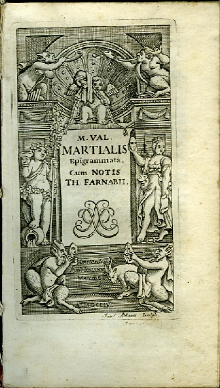 Do mědi rytý titulní list od Josefa Abbiatiho, tučně tištěné versálky ve výši 2-5 řádků, obrysové iniciálky na rostlinném pozadí ve výši 5 řádků, viněta za předmluvou, v úvodu stručný životopis Martiala od Petra Crinita, živá záhlaví, tištěné poznámky po stranách a pod jednotlivými epigramy oddělené jednoduchou linkou od epigramů tištěných kursivou. Poznámkami opatřil Thomas Farnaby. - Dobová pergamenová vazba, lehce ohmataná, ve hřbetu tři vazy, stříkané ořízky.