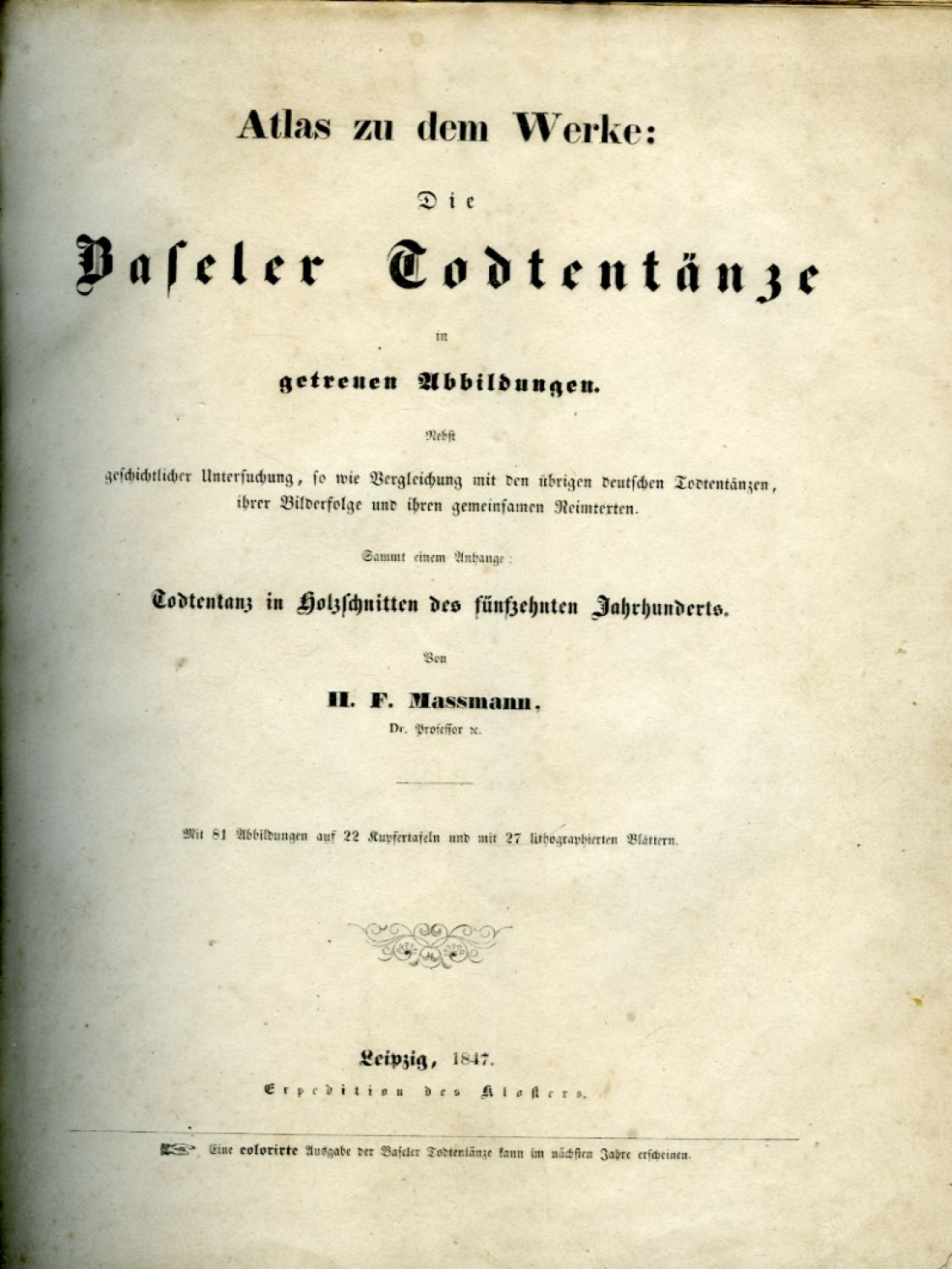 Atlas zu dem Werke: Die Baseler Todtentänze in getreuen Abbildungen. Nebst geschichtlicher Untersuchung, so wie Vergleichung mit den übrigen deutschen Todtentänzen, ihrer Bilderfolge und ihren gemeinsamen Reimtexten. Sammt einem Anhange: Todtentanz in Holzschnitten des fünfzehnten Jahrhunderts.