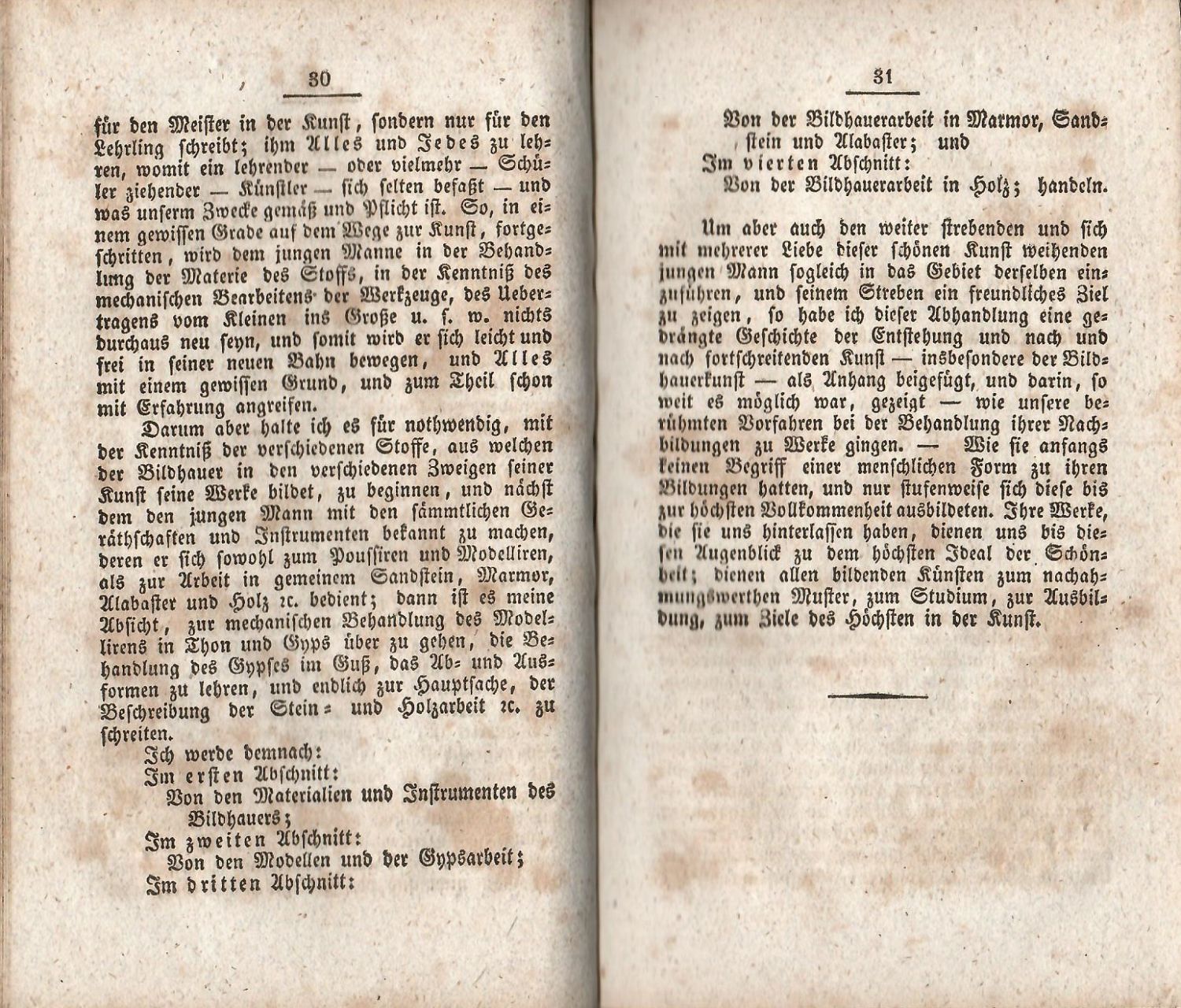 Die Kunst des Bildhauers in allen ihren Zweig´n, enthaltend eine theoretisch=praktische Anleitug zum Modelliren und wie man in Marmor, Alabaster, Sand= und andern Steinarten, desgleichen in Holz u.s.w. entwerfen und ausbilden soll; nebst einer Anweisung zum Schleifen und Poliren dieser verschiedenen Steinarten, zur Vergoldung u.s.w. auf Stein, und vorzüglich der Ausstaffirung und Vergoldung der Holzarbeiten etc.