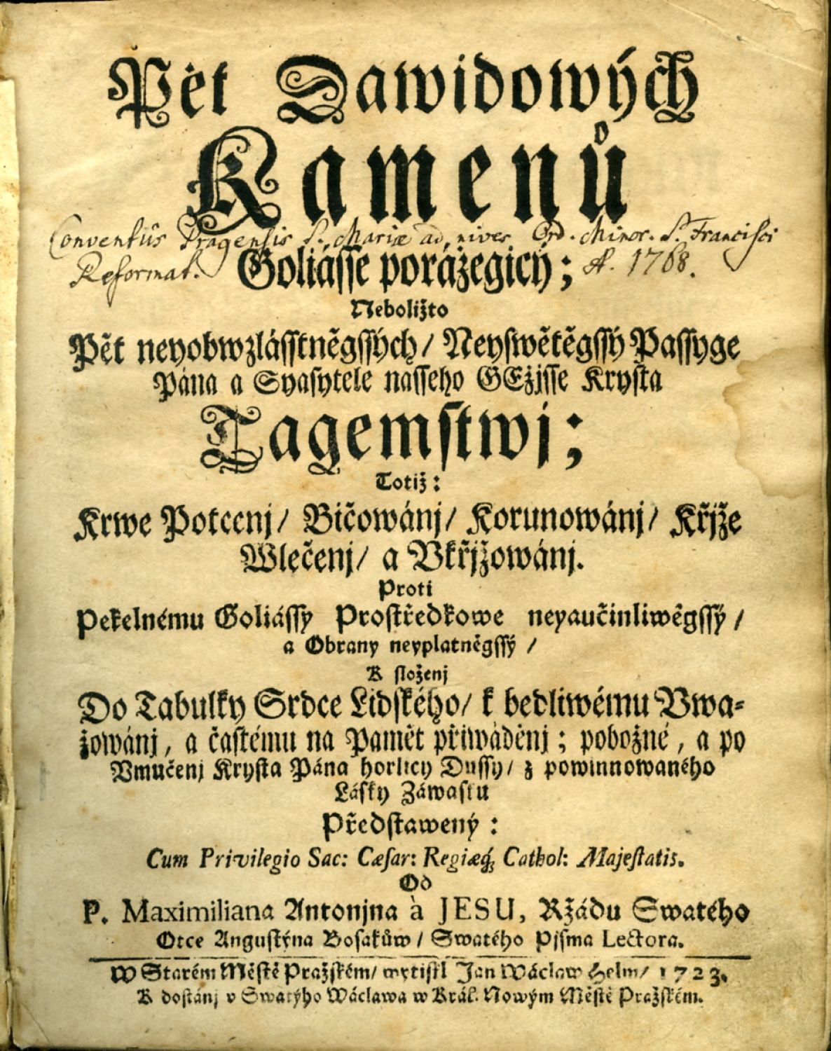Pět Dawidowých Kamenů Goliásse porážegicý; Neboližto Pět neyobwzlásstněgssých / Neyswětěgssý Passyge Pána a Spasytele nasseho GEžjsse Krysta Tagemstwj; Totiž: Krwe Potcenj / Bičowánj / Korunowánj / Křjže Wlečenj / a Vkřjžowánj. Proti Pekelnému Goliássy Prostředkowe neyaučinliwěgssý / a Obrany neyplatněgssý / K složenj Do Tabulky Srdce Lidského / k bedliwému Uwa=žowánj, a častému na Paměť přiwáděnj; pobožné, a po Vmučenj Krysta Pána horlicy Dussy / z powinnowaného Lásky Záwasku Předstawený: ...