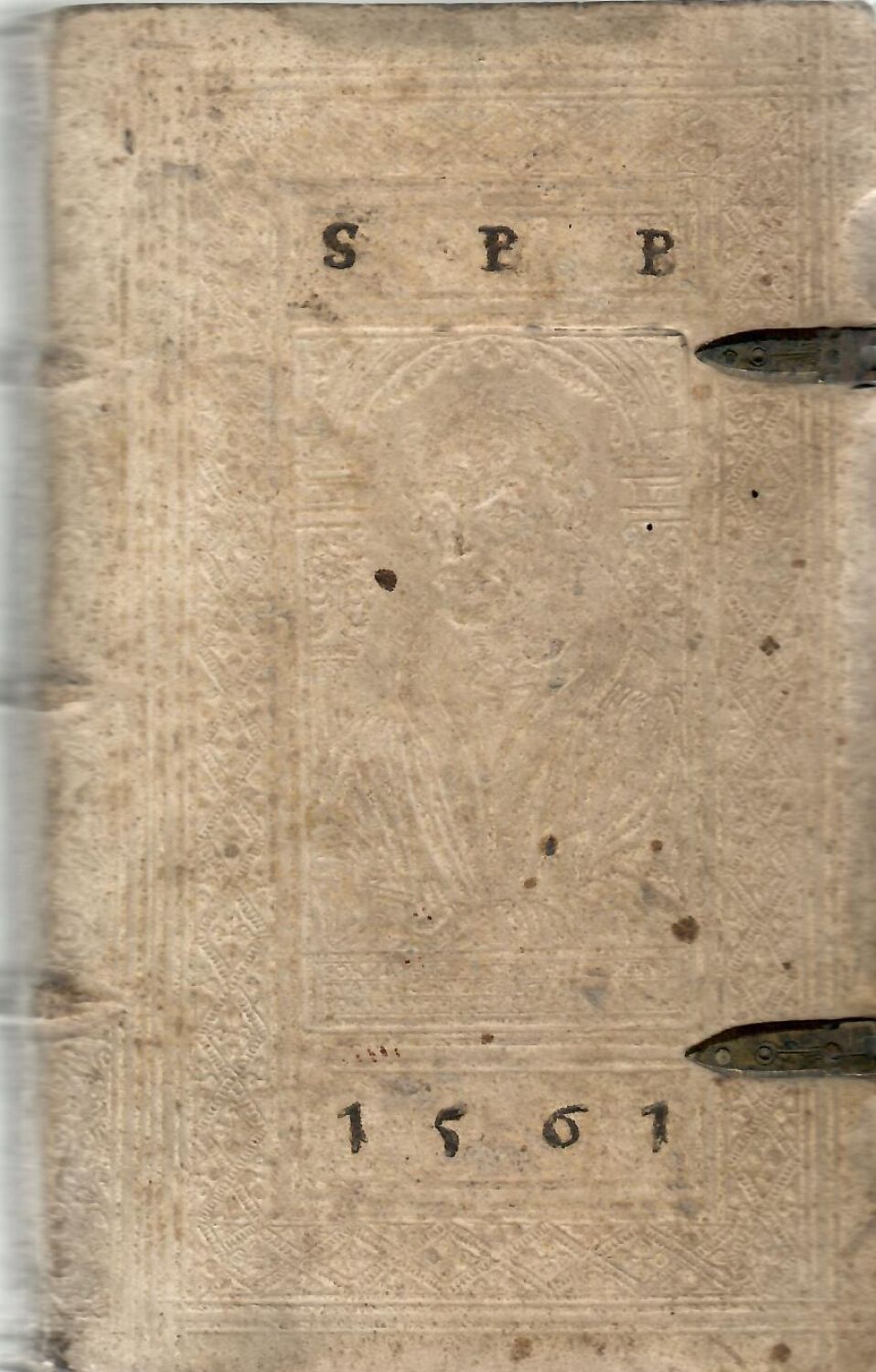Dobová renesanční vazba ze světlé vepřovice, na přední desce zdobená slepotiskovým zrcadlem, uvnitř zrcadla portrét Melanchtonův, nad ním tlačené iniciály SPP a pod ním tlačená datace 1561, na desce zadní uvnitř zrcadla portrét Lutherův. Na přední desce dva původní kovové úchyty, na desce zadní dvě přezky s původními kovovými sponami. Na přední předsádce přes celou plochu rkp. přípis v řeckém a v závěru v latinském jazyce od Caspara Crucigera s jeho podpisem na konci (celkem 23 řádek rukopisu, ve kterém autor cituje text kánonu z nicejského koncilu o eucharistii, poznamenává tajemství proměny chleba a vína v tělo a krev Kristovu. Na konci datace 3. September (bez uvedení roku) a podpis.
