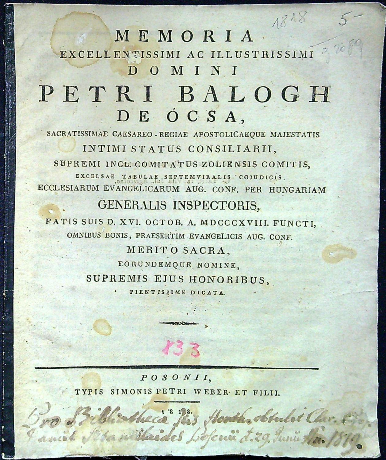 MEMORIA EXCELLENTISSIMI AC ILLUSTRISSIMI DOMINI PETRI BALOGH DE ÓCSA, SACRATISSIMAE CAESAREO-REGIAE APOSTOLICAEQUE MAJESTATIS INTIMI STATUS CONSILIARII, SUPREMI INCL. COMITATUS ZOLIENSIS COMITIS, EXCELSAE TABULAE SEPTEMVIRALIS COJUDICIS, ECCLESIARUM EVAGELICARUM AUG. CONF. PER HUNGARIAM GENERALIS INSPECTORIS, FATIS SUIS D. XVI OCTOB. A. MDCCCXVIII. FUNCTI, OMNIBUS BONIS, PRAESERTIM EVANGELICIS AUG. CONF. MERITO SACRA, EORUNDEMQUE NOMINE, SUPREMIS EJUS HONORIBUS, PIENTISSIME DICATA.