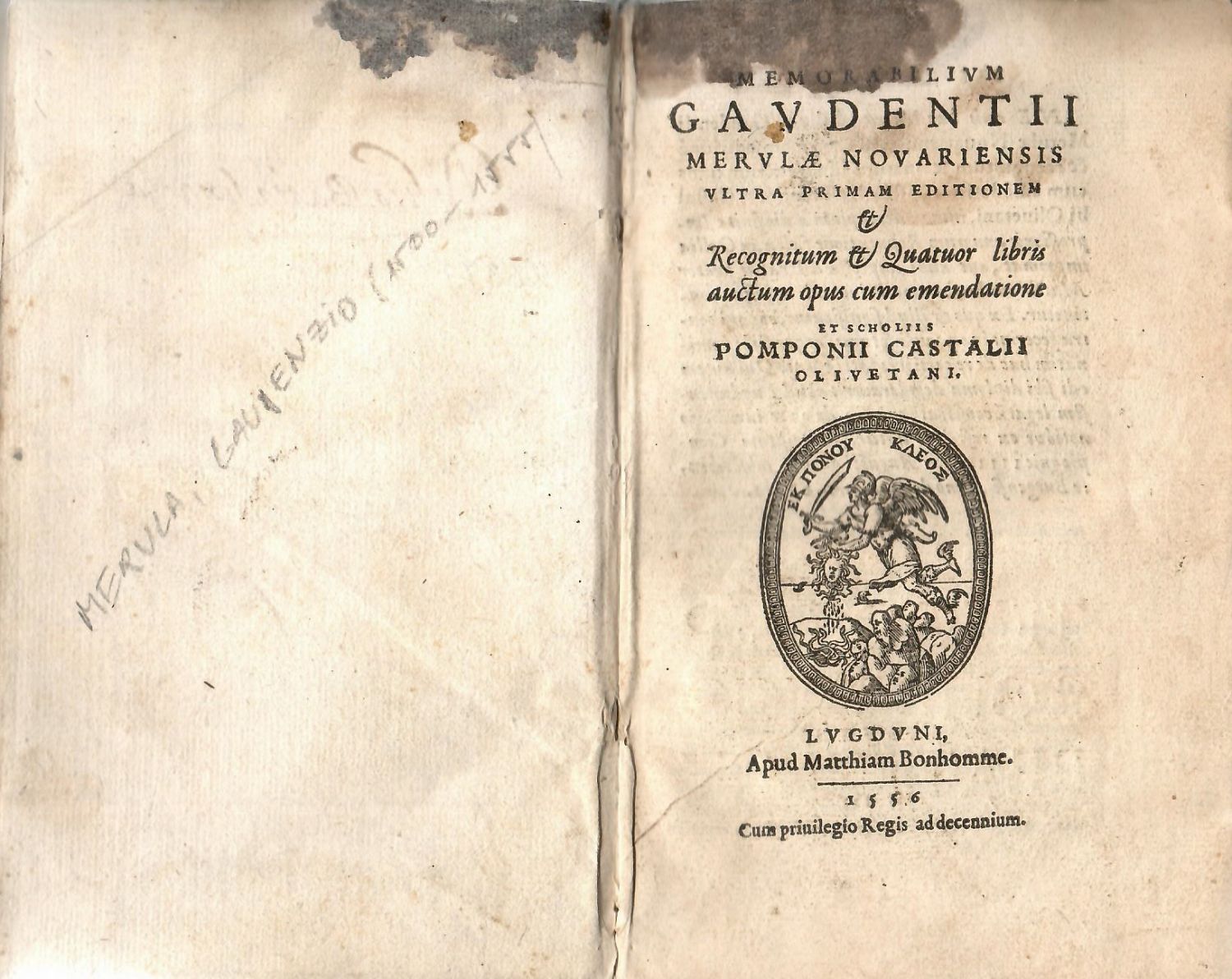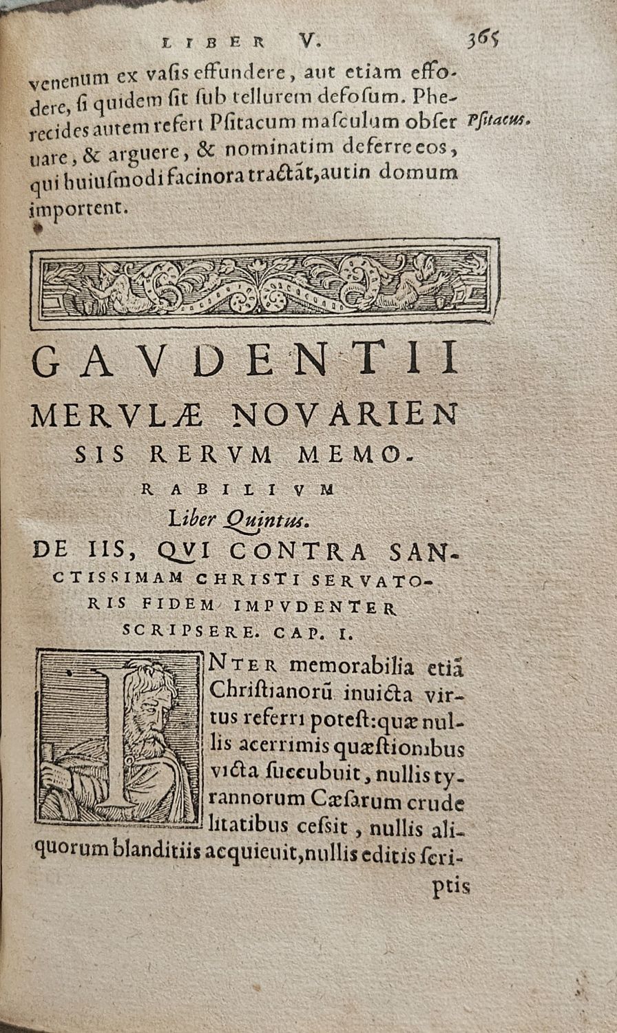 MEMORABILIVM GAVDENTII MERVLAE NOVARIENSIS VLTRA PRIMAM EDITIONEM et Recognitum et Quatuor libri auctum opus cum emendatione et scholiis POMPONII CASTALII OLIVENTANI.