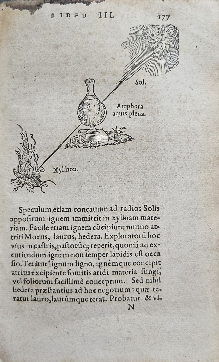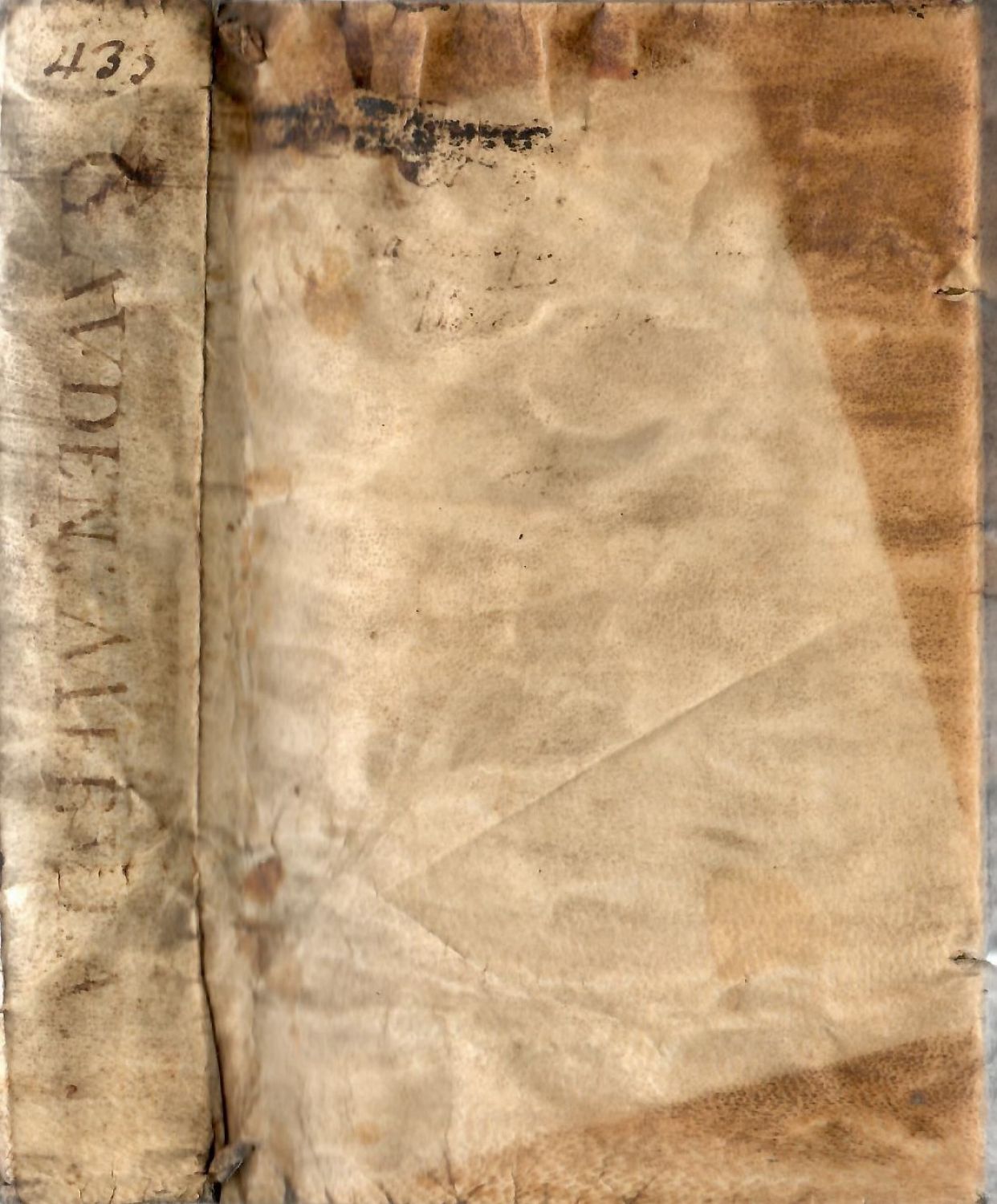 Dobová pergamenová vazba, zkrabatělá a při okrajích zahnědlá (odborně vyčištěná), papír místy zahnědlý, horní ořízka z jedné třetiny prolitá černým inkoustem, který se též vsákl do horního okraje papíru (bez zásahu do textu), knižní blok odborně vyčištěný a odkyselený. Na přední předsádce nečitelný vlastnický přípis s číslem. Vypichované ořízky, na spodní inkoustem jméno autora knihy.