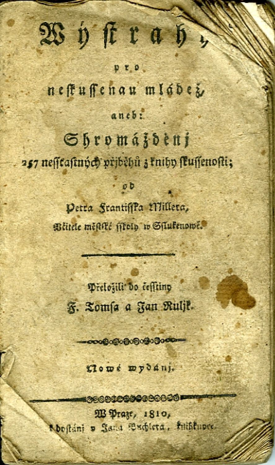 Wýstrahy pro neskussenau mládež, aneb: Shromážděnj 257 nessťastných přjběhů z knihy skussenosti; od Petra Františka Millera, Včitele městské sskoly w Sslukenowě. Přeložili do česstiny F. Tomsa a Jan Ruljk. Nowé wydánj.