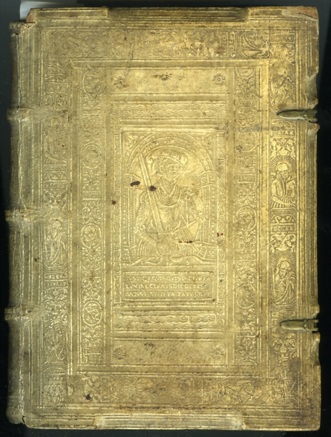 Renesanční kožená vazba zdobená slepotiskem, dvojité zrcadlo, ve vnějším rámu podobizny starozákonních proroků, v rámu vnitřním podobizny církevních reformátorů a humanistů (Jan Hus, Martin Luther, Erasmus Rotterdamský, Philipp Melanchton), uvnitř zrcadla na přední desce alegorie spravedlnosti, na desce zadní biblický výjev, ve hřbetu tři vazy, na přední desce zbytky kovových úchytů, na zadní torsa spon. Vazba ohmataná a místy odřená, na předním přídeští nalepeno mědirytinové barokní ex libris pro M. Car. Chr. Gercke.