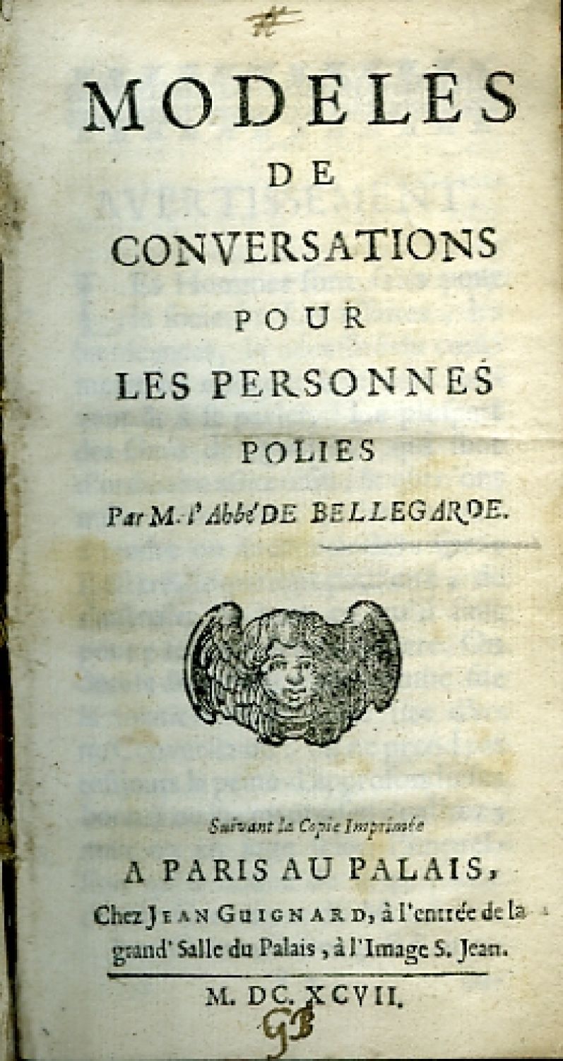 + přívazek: Morvan de Bellegarde: Reflexions sur le ridicule et sur les moyens de l´eviter, ou sont representez les Moeurs & les différens Caractéres des Personnes de ce Siécle. Paris, Jean Guignard, 1697, [VIII]-291-[XXIII] str., na tit. listu viněta, pásové vlysy, vstupní konturová iniciála na rostlinném pozadí ve výši 8 řádků, viněty, tučně tištěné versálky ve výši 2 řádků, živá záhlaví.