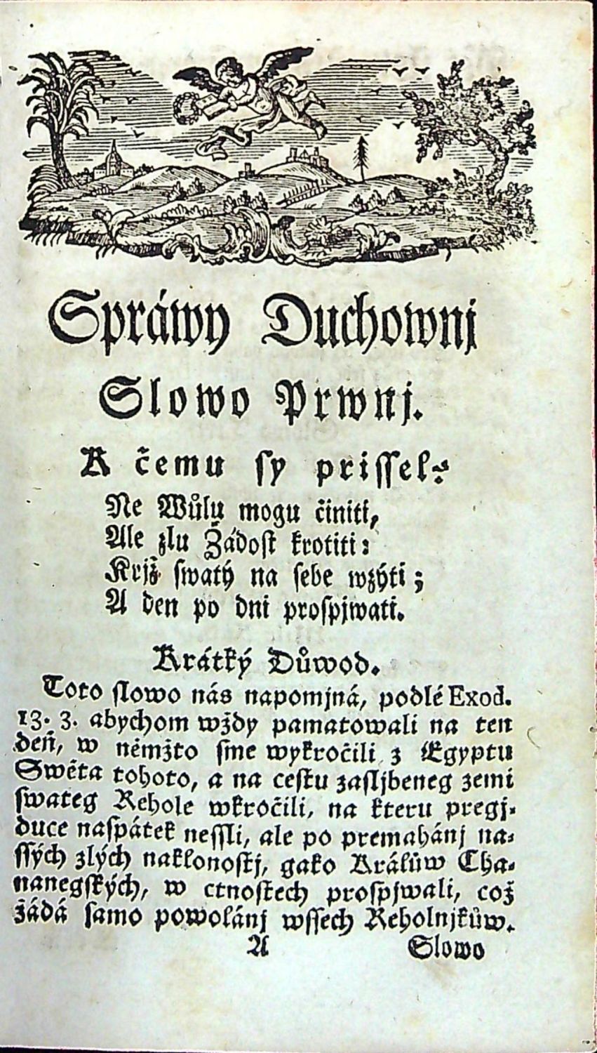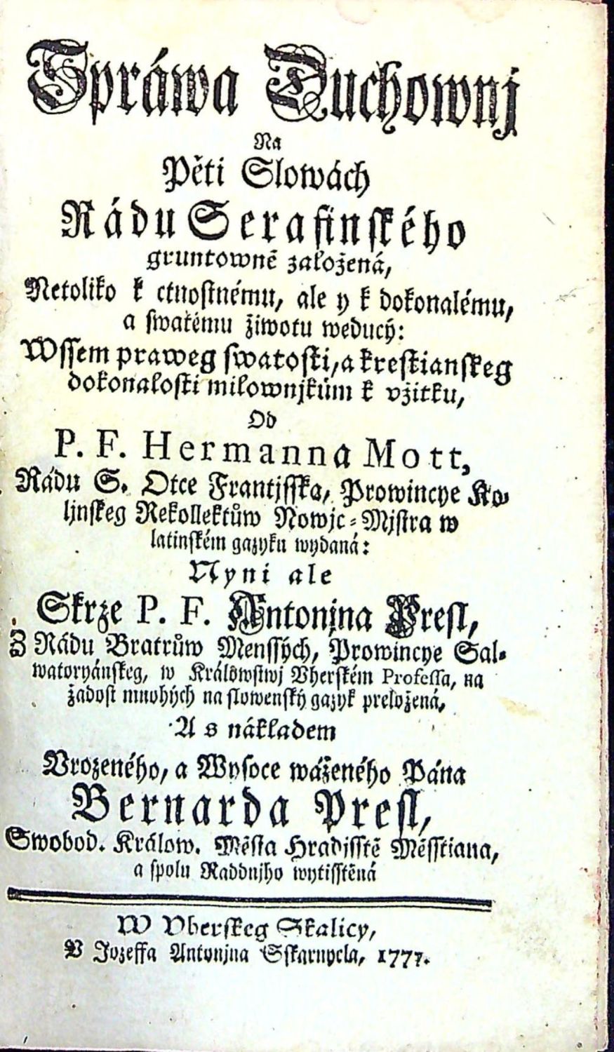 Spráwa Duchownkj Na Pěti Slowách Rádu Serafinského gruntowně založená, Netoliko k ctnostnému, ale y k dokonalému, a swatému žiwotu weducý: Wssem praweg swatosti, a krestianskeg dokonalosti milownjkům k vžitku, od .....