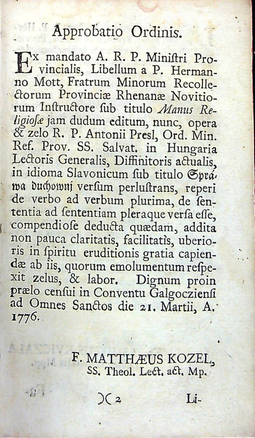 Dobová vazba z temně hnědé hověziny, ve hřbetu 4 vazy, červeně barvené ořízky. Od strany 3 po str. 23 při horním vnitřním okraji drobná cestička způsobená červotočem. Na přední předsádce rkp. přípis černým perem z roku 1777 "Conventi Bartphensi per ipsum et Authorem oblatus tempore Capituli in Conventu Gyöngyösiensi Celebrati. 1777".