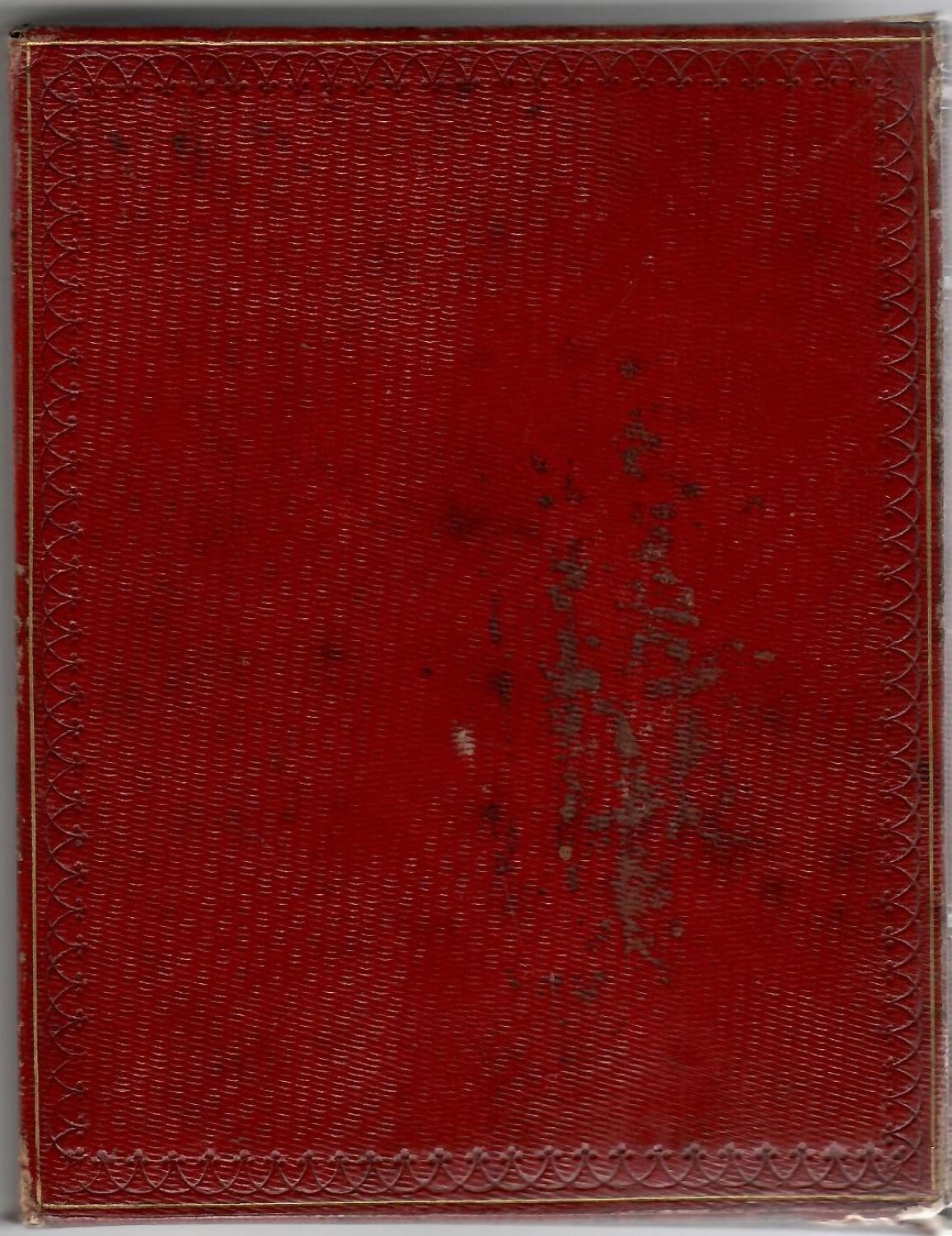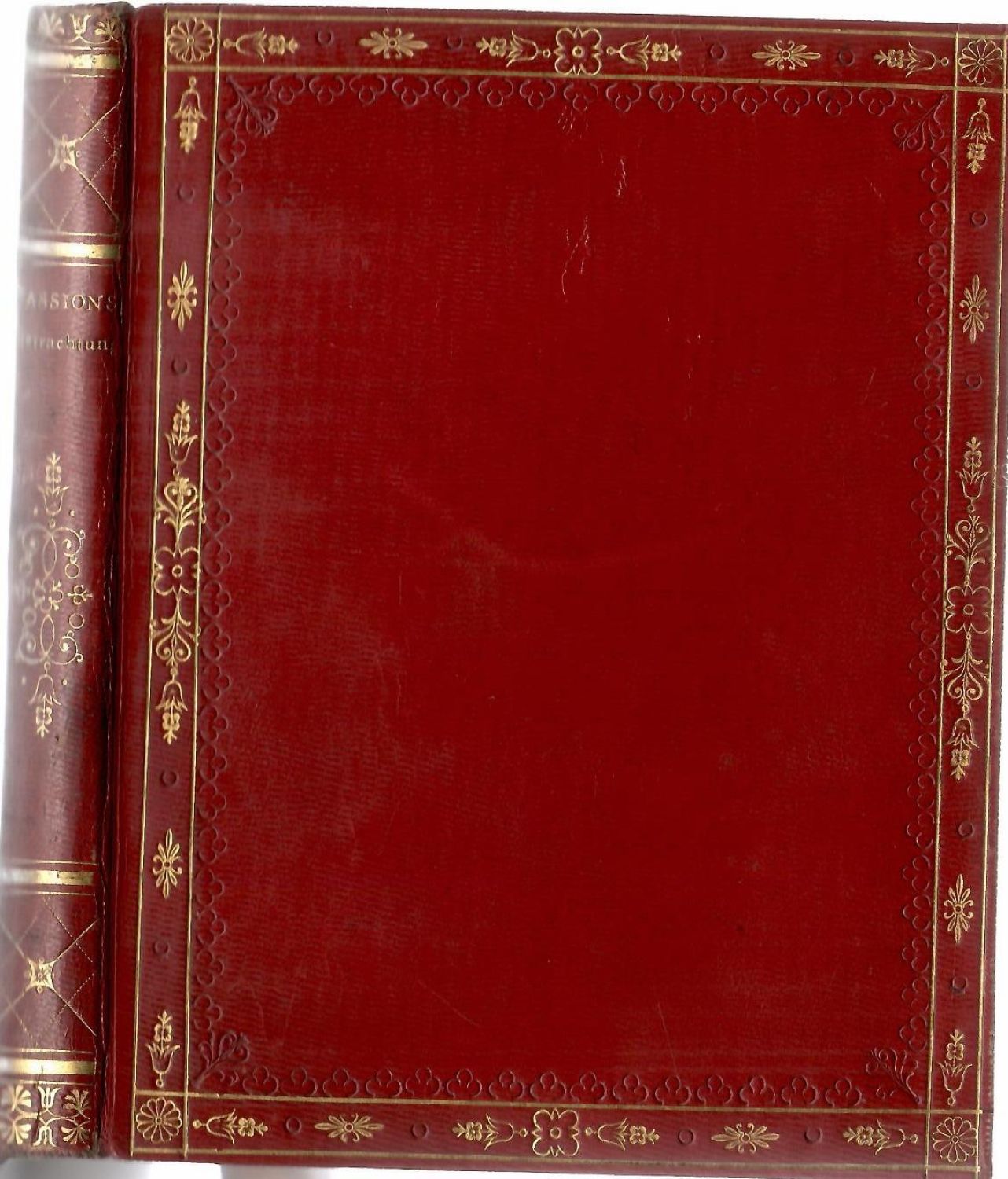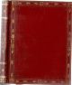Krásná dobová empírová individuální vazba z červeného marokénu, na obou deskách tlačený a zlacený rám zdobený květinovými girlandami, na přídeštích a předsádkách moaré, na přídeštích olemované marokénovým pokryvem zdobeným zlaceným ornamentem, původní ochranné kartonové pouzdro potažené červeným marokénem se vzorem "pointillé" olemované tlačeným ornamentem. Pouzdro při horním vnějším okraji natržené a na zadní straně lehce odřené. Zlacené ořízky.