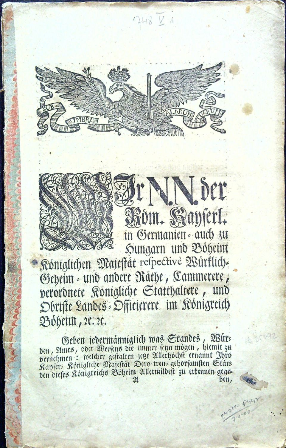 WIr N.N. der Röm. Kayserl. in Germanien= auch zu Hungarn und Böheim Königlichen Majestät respective Würklich Geheim = und andere Räthe, Cammerere, vorordnete Königliche Statthaltere, und Obriste Landes = Offieirere im Königreich Böheim, etc. Geben jedermänniglich was Standes, Würden, Amts, oder Weesens die immer seyn mögen, hiemit zu vernehmen: welcher gestalten jetzt Allerhöchst ernannt Ihro Kayser = Königliche Majestät Dero treu = gehorsamsten Ständen diese Königreichs Böheim Allermildest zu erkennen gegeben, ......