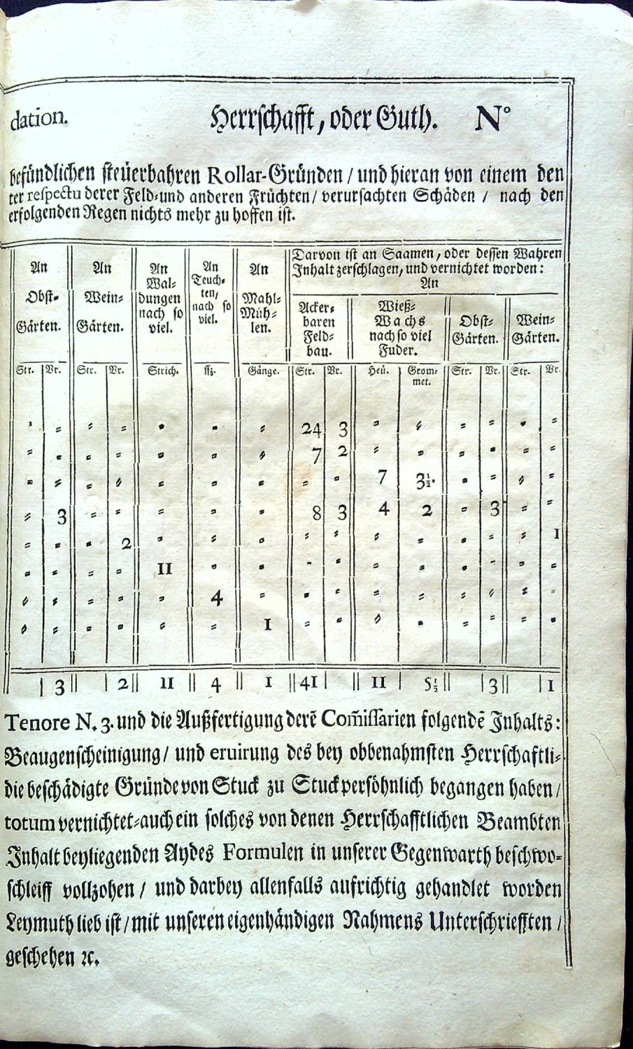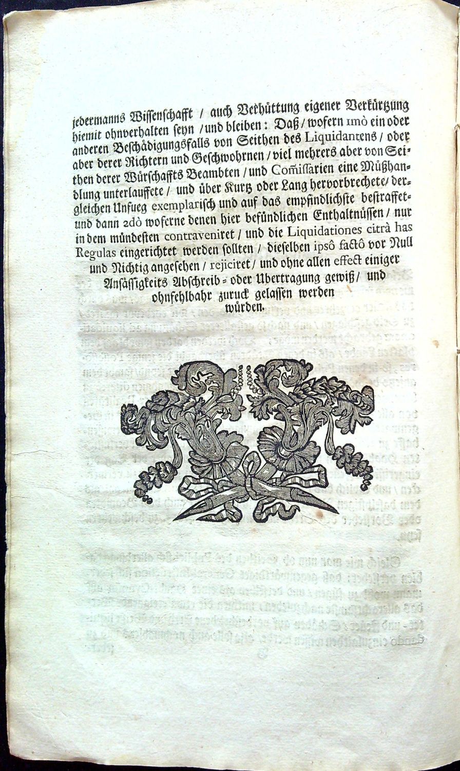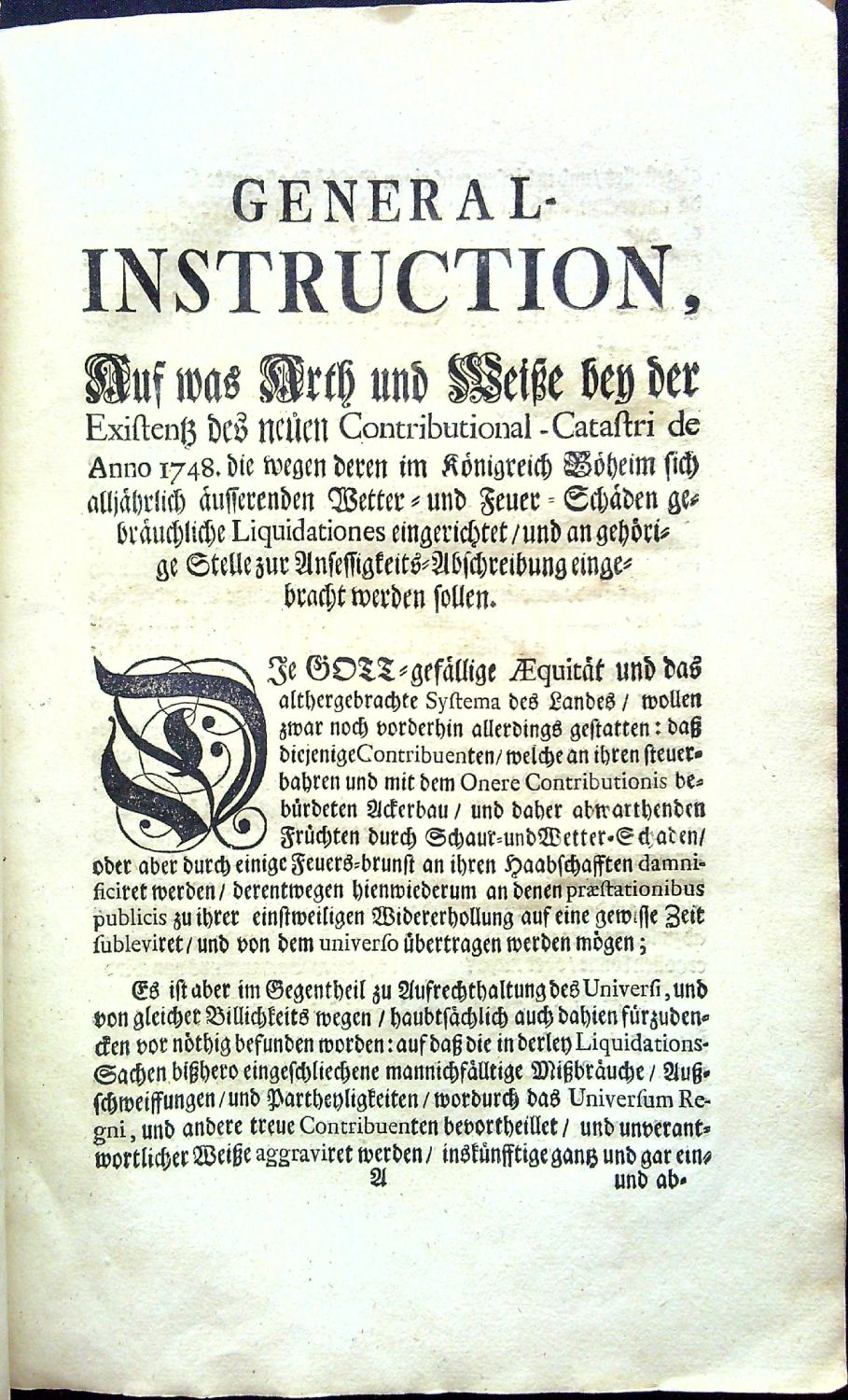 Tištěno švabachem, latinská slova antikvou. Nepaginováno, na rubu čtvrtého listu (folia B2) pět tištěných kulatých razítek L.S. (locus sigilli), nad nimi datace (1.5. 1748 na Pražském hradě) a pod nimi vytištěno jméno Johann Joseph Mussik. Iniciály propletené úponky zalomené do výše 3-7 řádků, barokní viněta z rostlin a ornamentů. Na pátém listu (folio A1) "GENERAL = INSTRUCTION, Auff was Arth und Weiße bey der Existentz neüen Contributional-Catastri de Anno 1748. die wegen deren im Königreich Böheim sich alljährlich äusserenden Wetter = und Feuer = Schäden gebräuchliche Liquidationes eingerichtet/ und an gehörige Stelle zur Ansessigkeits=Abschreibung eingebracht werden sollen". Na devíti listech bez signatur tištěné příklady likvidace a jejího odpisu. - Císařský patent vycházející z již zastaralého patentu Karla VI., který se zabývá povětrnostními škodami a požáry, jejich likvidací a případnými odpisy.