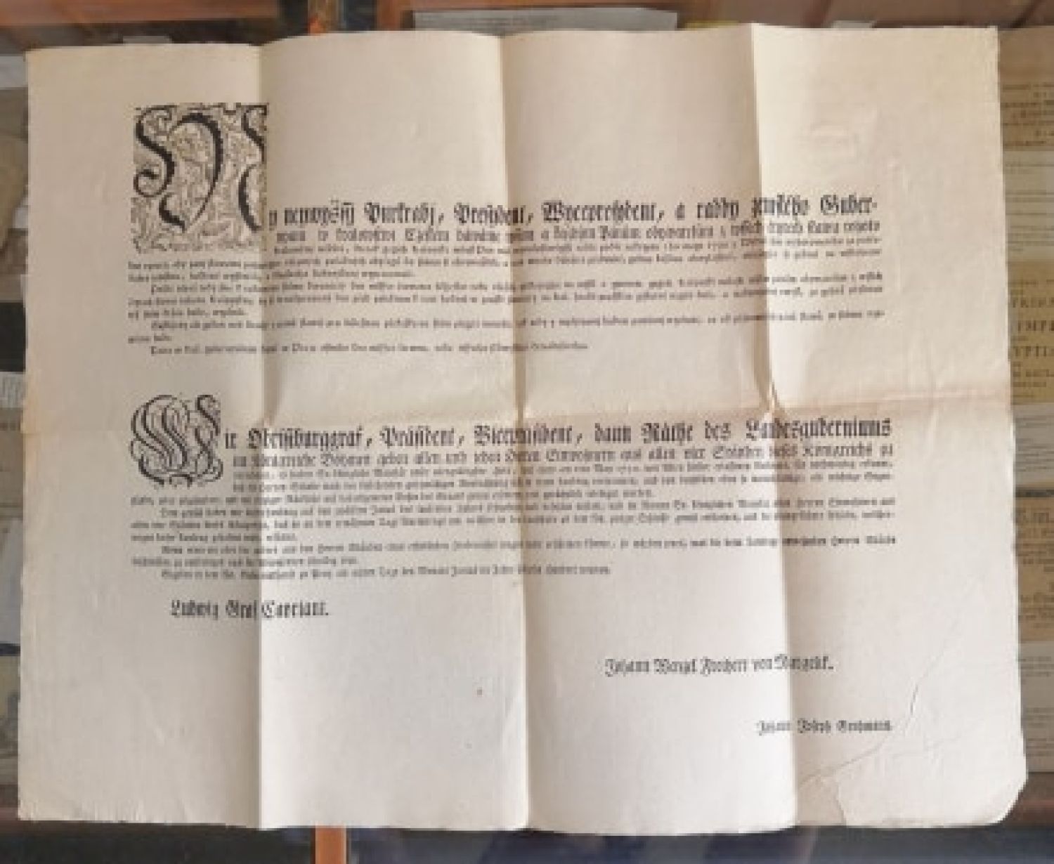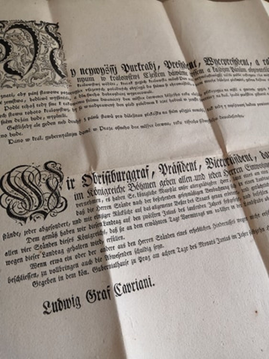 Česko-německý text tištěný frakturou, na začátku českého textu dřevořezová konturová iniciála zakomponovaná do rostlinné kompozice o rozměru 95 x 83 mm, německý text uvozen iniciálou s propletenými úponky o rozměru 60 x 55 mm. Vlevo dole Ludwig Graf Cavriani, vpravo dole Johann Wenzel Freiherr von Margelik, Johann Joseph Grohmann. - List třikrát přeložený, čistý, v pravém dolním rohu mírně pomačkaný.