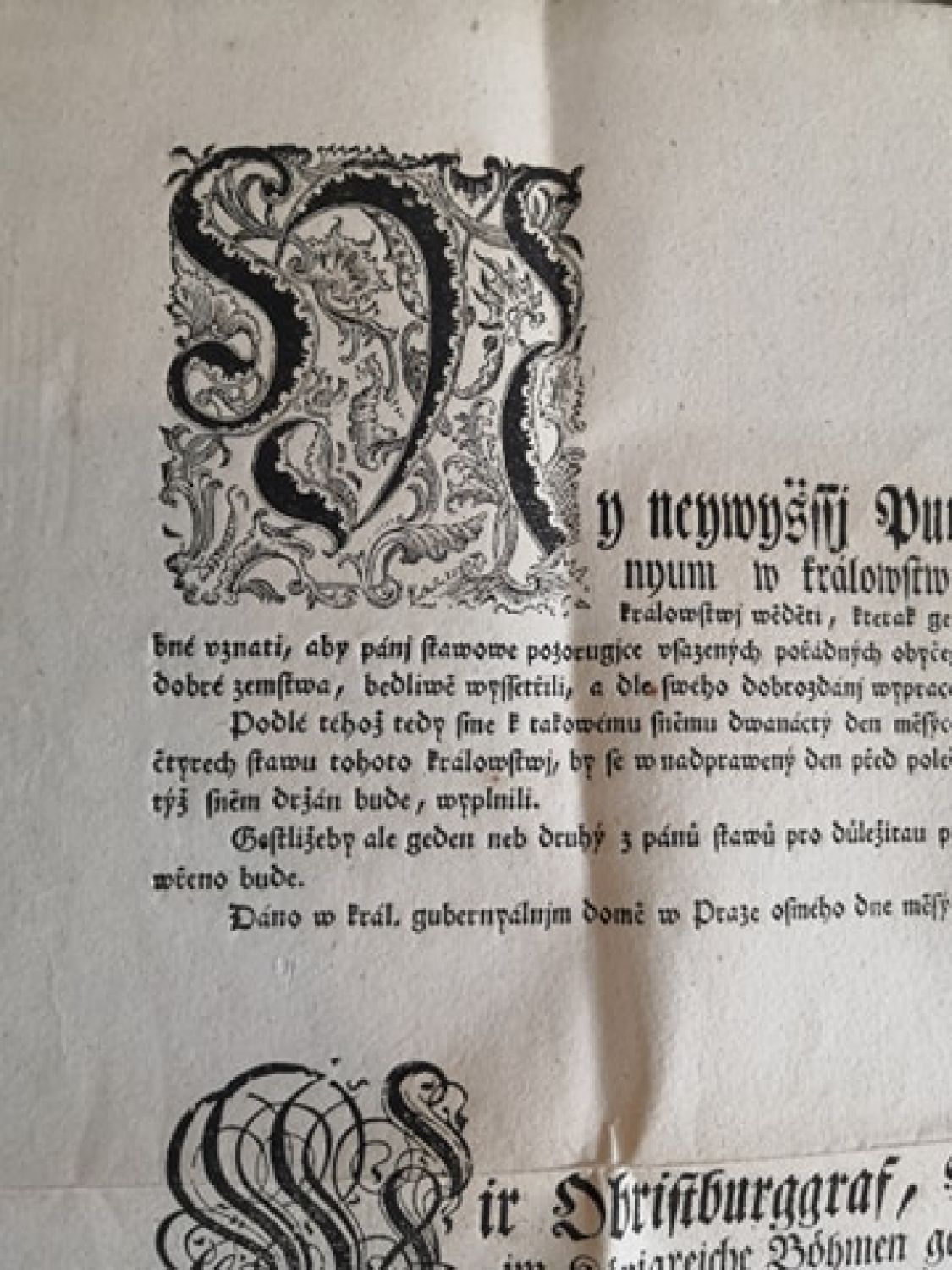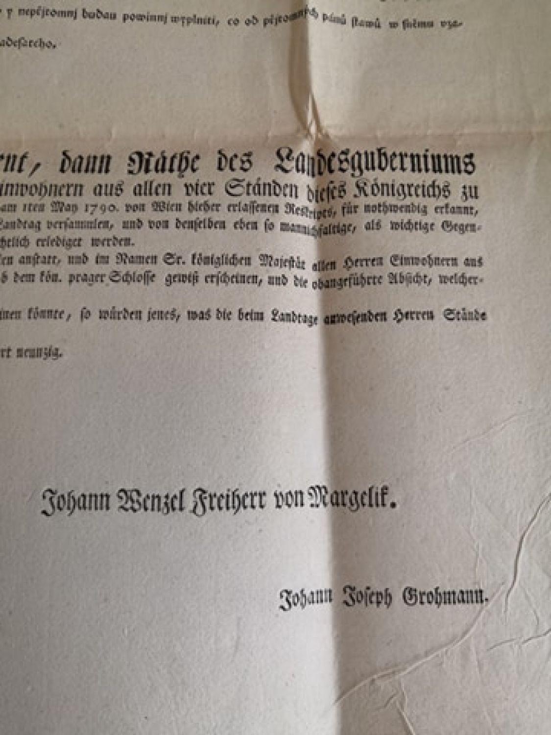 My neywyšssj Purkrabj, Presydent, Wycepresydent, a raddy zemského Gubernyum w králowstwj Cžeském dáwáme wssem a každým Pánům obywatelům z wssech čtyřech stawu tohoto králowstwj wěděti, kterak gegich králowská milost Pán náš neymilostiwěgssj ráčili podlé reskryptu I ho máge 1790 z Wjdně sem wyhotoweného za potřebné vznati, aby pánj stawowe pozorugjce vsazených pořádných obyčegů do sněmu se shromáždili, a tam mnohé důležité předměte, gednu každou obwzlásstně, ohljžegjce se gedině na wsseobecné dobré zemstwa, bedliwě wyssetřili, a dle swého dobrozdánj wyprawowali.