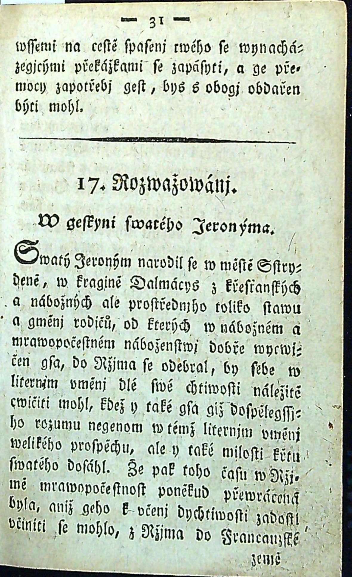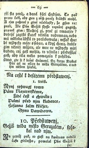 Tištěno švabachem, jednoduché a ozdobné linky, koncová vinětka, plné tučně tištěné iniciálky ve výši 1-2 řádků, na straně 37 (nepaginované) titulní list druhé části: "Žiwotné Předstawenj žiwota, vmučenj a smrti Pána a Spasytele nasseho Gežjsse Krysta, s připogenjm Audolj Jozaffat, skrze něgž potok Cedron, přitom studnice Gihon, rybnjk Syloe, rybnjk bráwnj Bethsayda teče, též hráz rybnjka Bersábe, hora Kwarantána, a co se zběhlo w Bethányi, a na Hoře Oliwetské až na Horu Kalwáryi; gakož také zgewenj na Hoře Tábor, Oreb, a Synay. Skrze sedmdesáte čtyry sstacy, wsse žiwě a s pohnutedlným rozgjmánjm se předstawuge, a od mnoho tisýc lidj pobožně se nawsstěwuge. V zázračného obrazu P. Marye w Wambeřicých na hoře Syon w hrabstwj Glackém". Ve druhé části 72 arabsky číslovaných "Předstawenj ze žiwota Gežjsse" na rozdíl od popsaných exemplářů v Knihopisu doplněných o písně.