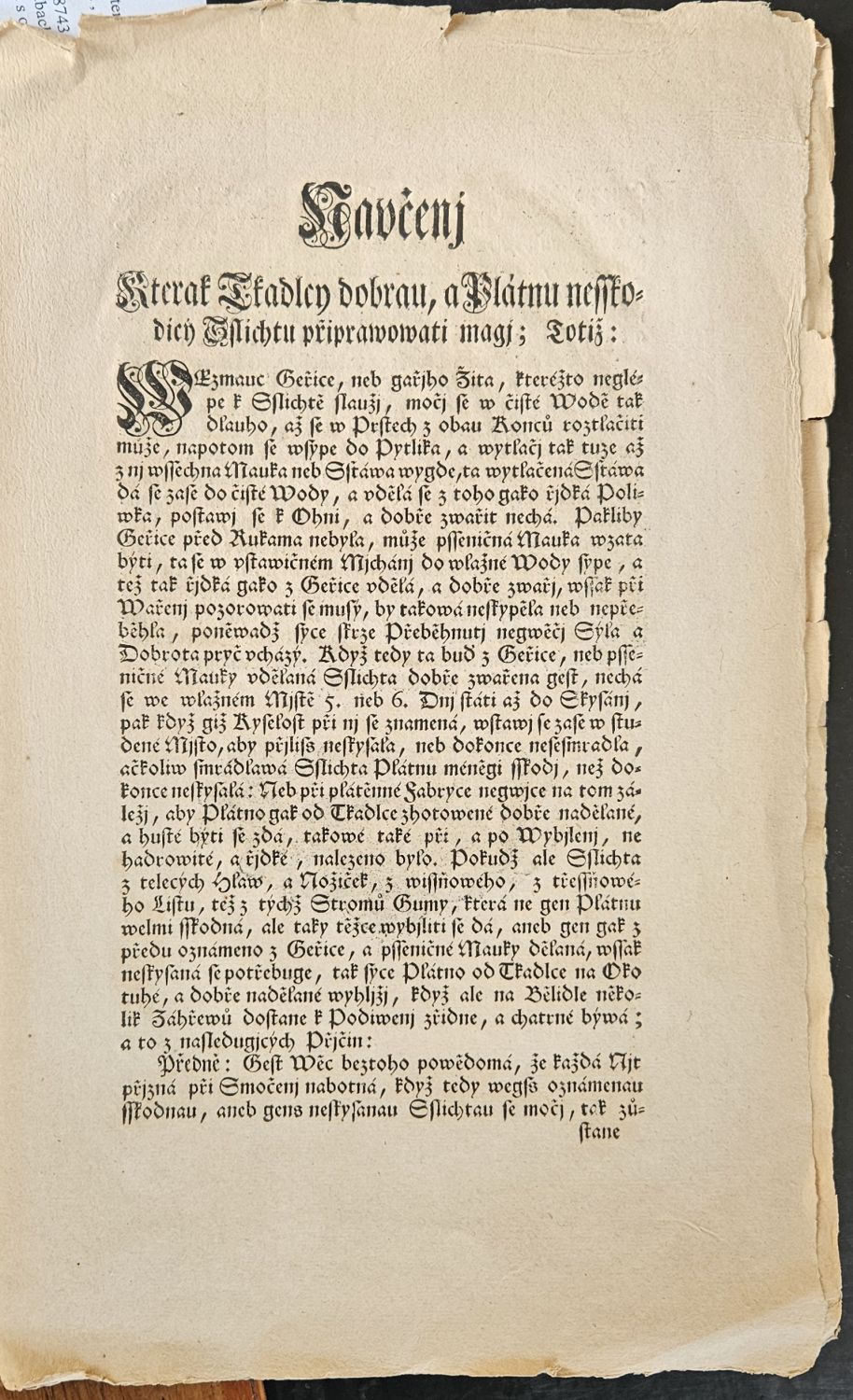 Naučenj Kterak Tkadlcy dobrau, a Plátnu nesskodicý Sslichtu připrawowati megj; Totiž: