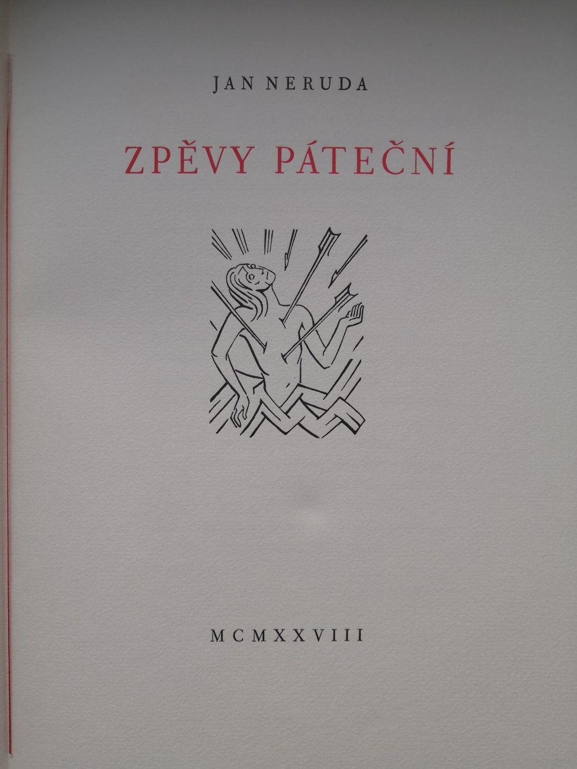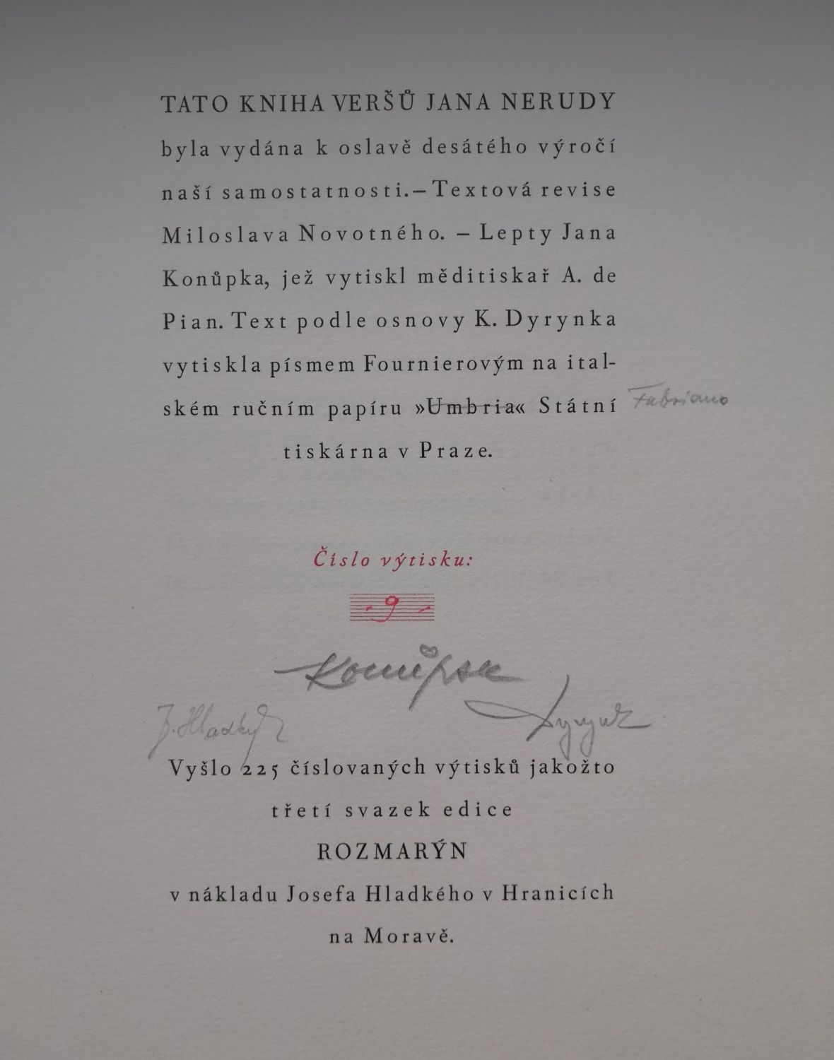 Ex. č. 9 z 225 vydaných a tištěných na italském ručním papíře Fabriano, Konůpkovy lepty vytiskl Alessandro de Pian v Praze, text podle osnovy Karla Dyrynka písmem Fournierovým vytiskla Státní tiskárna v Praze. V tiráži tužkou podpisy Jana Konůpka, Josefa Hladkého a Karla Dyrynka. - Původní obálka s červeným přebalem s chlopněmi, na přední straně papírový štítek s věcným názvem, na předsádkách modře barvený papír. Původní kartonové ochranné pouzdro, odřené a při horním i spodním kraji natržené, kniha samotná ve stavu intaktním.