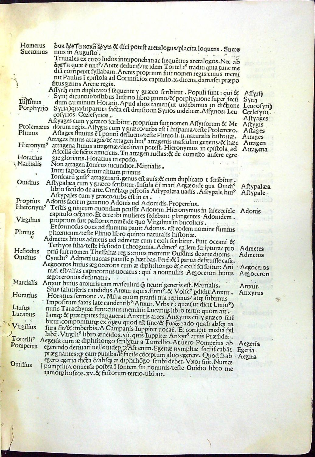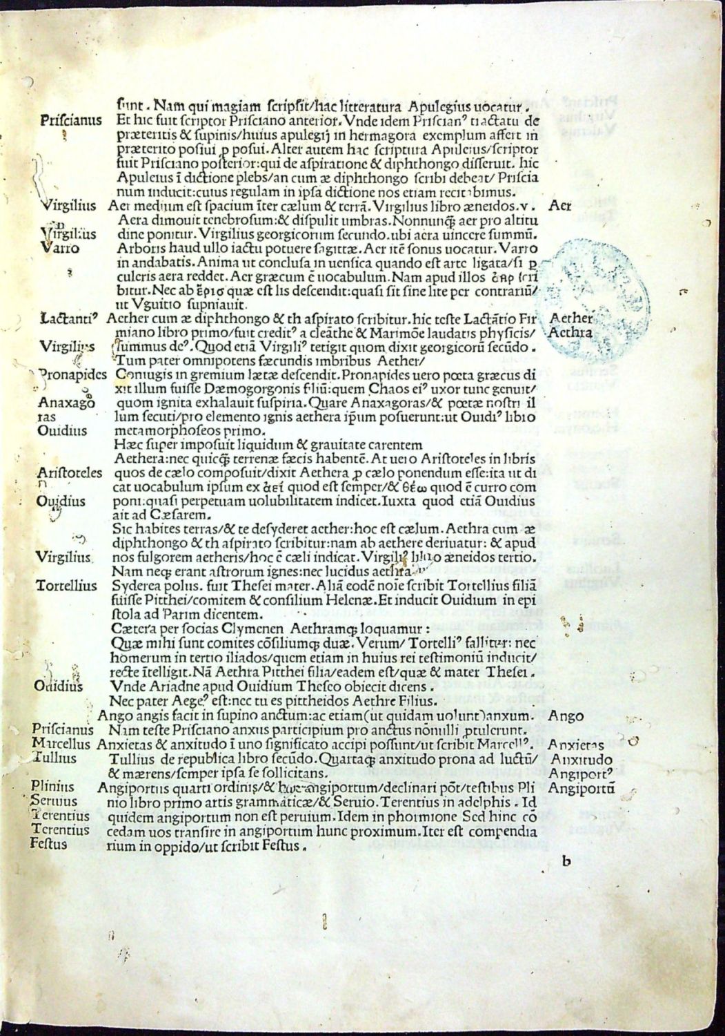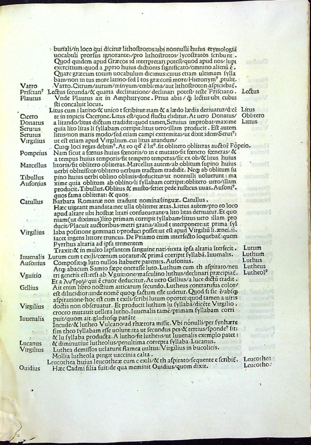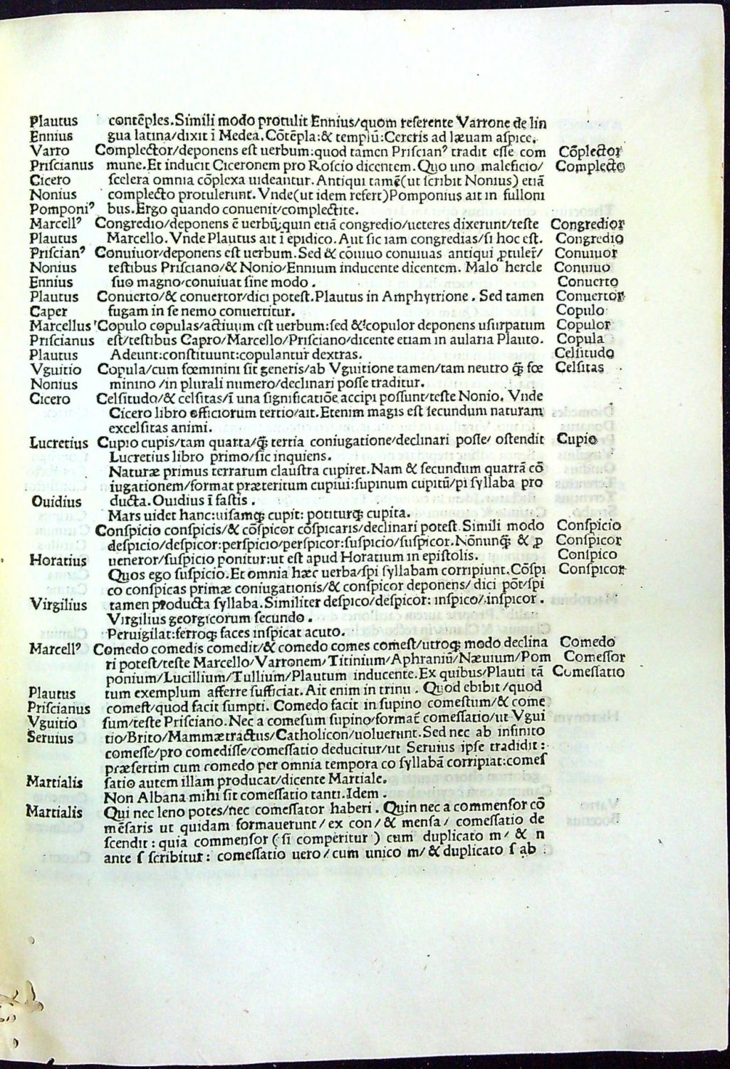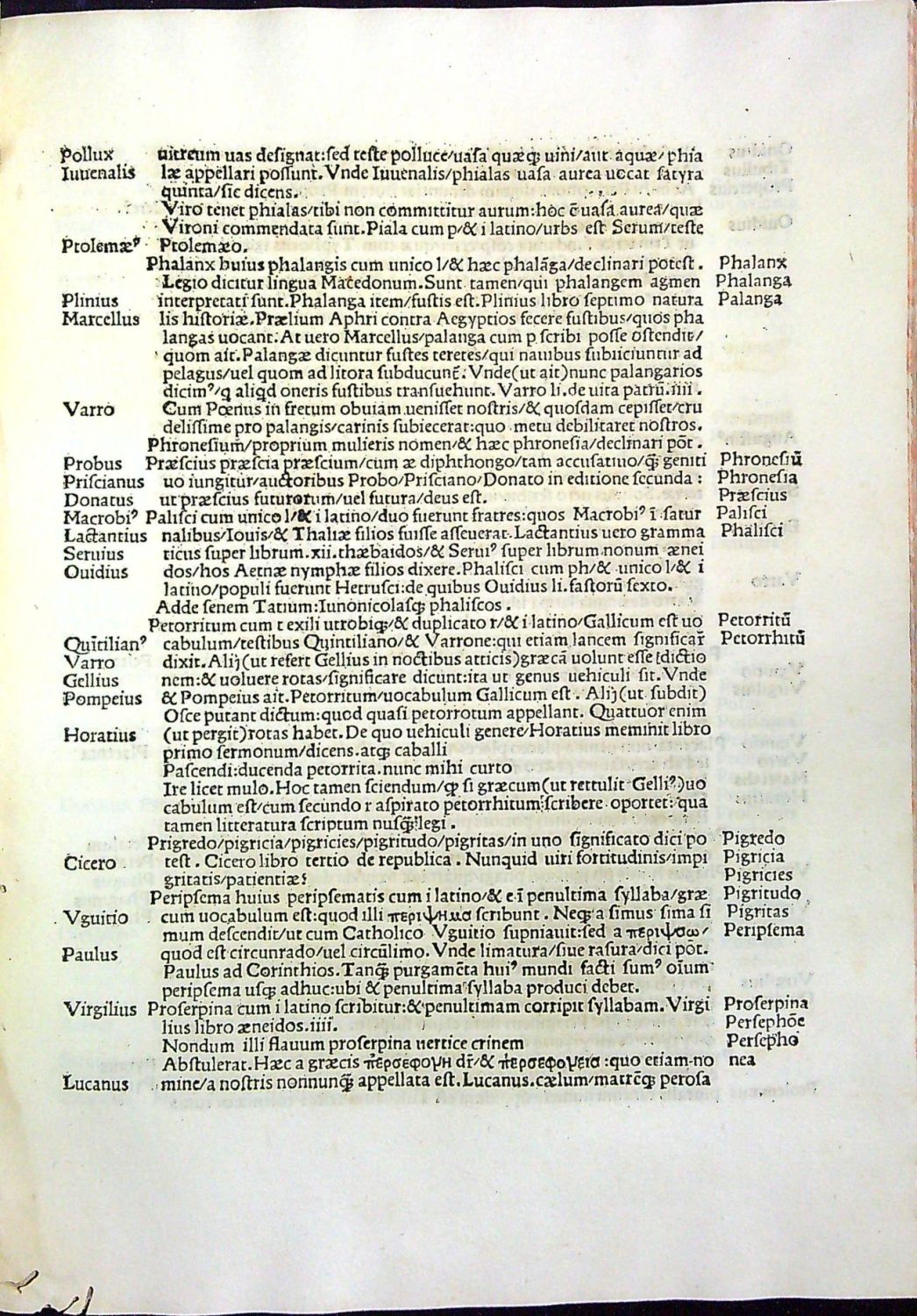 Tištěno antikvou, 53 řádků, tištěné marginálie po stranách (na pravém okraji slova jejichž etymologie a příklady jsou uvedeny v hlavním textu, na levém okraji jména autorů, ze kterých jsou ukázky čerpány).