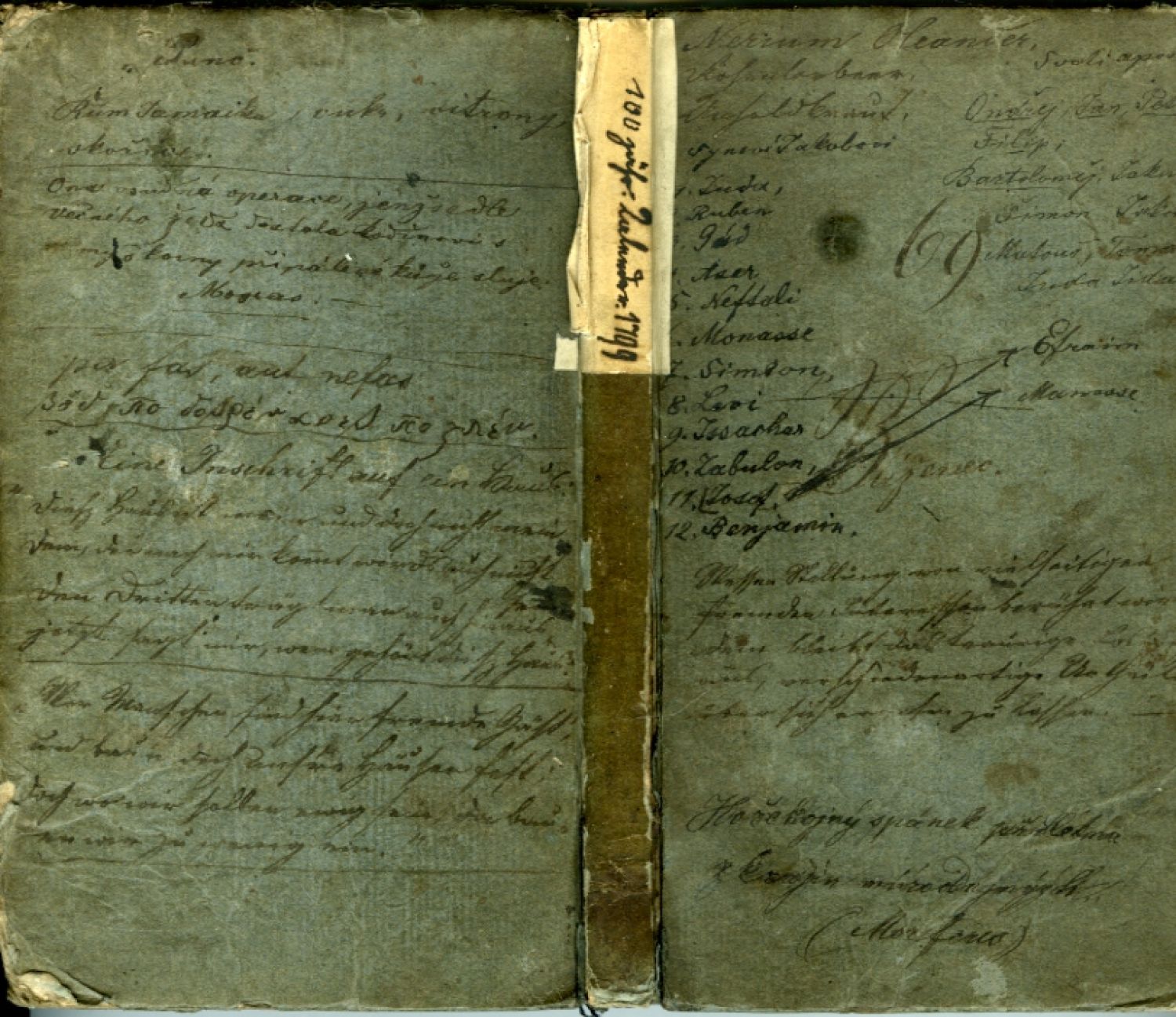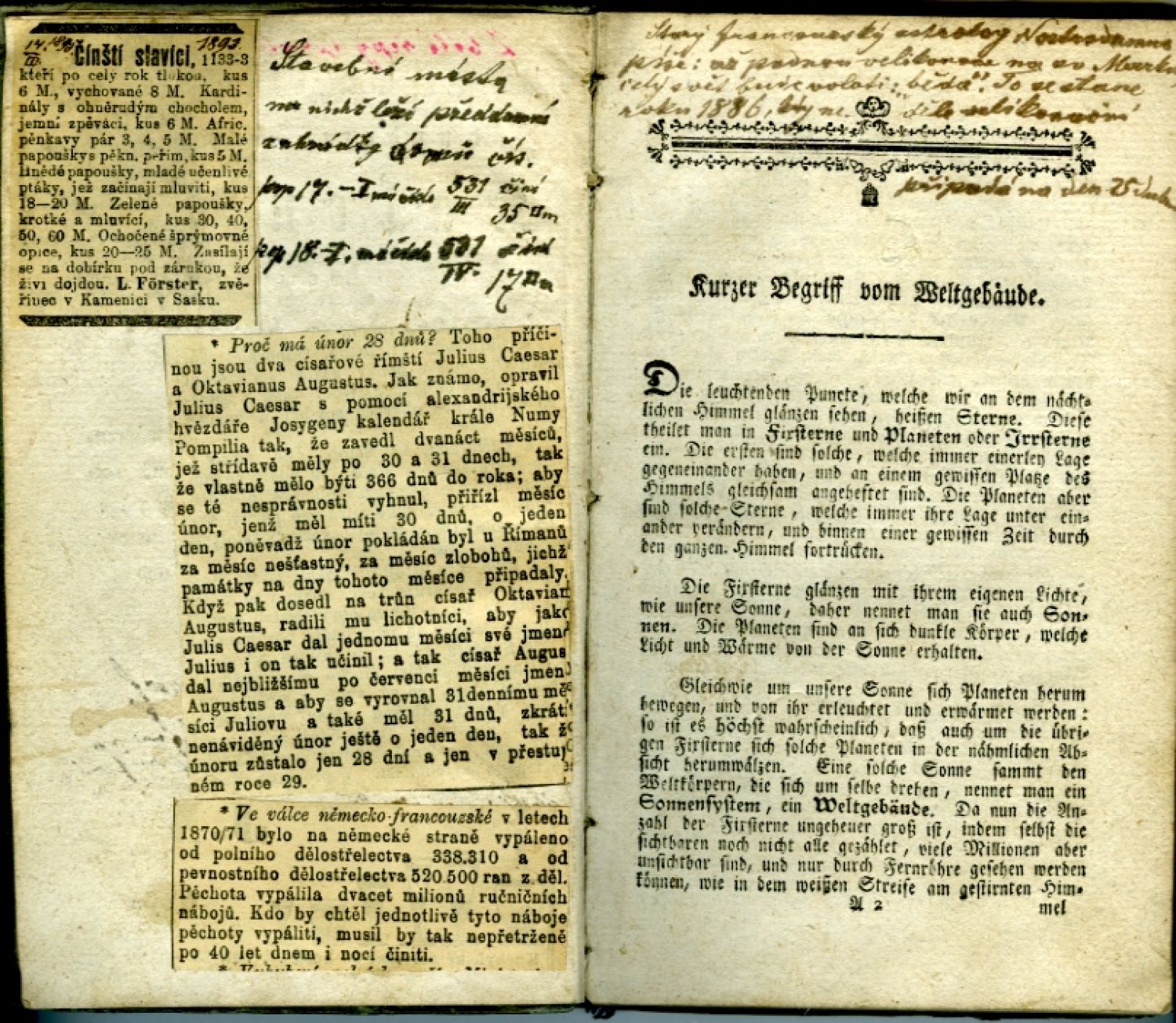 Vazba silně ohmataná, podél hřbetu naprasklá, horní třetina hřbetu přelepena bílým papírem s rkp. věcným názvem, hrany odřené, rohy naražené. Obě desky, přídeští, předsádky, přední a zadní listy hustě popsány starou rukou českými i německými poznámkami, na obou stranách tit. listu, s. 92 a zadním přídeší nalepeny výstřižky z českých novin, za poslední stranou obsahu vlepeny čtyři listy též s novinovými výstřižky a česky psanou "Pranostikou z povětrnosti od 24.XII.1893 do 6.I.1894"; na horním okraji listů průběžně lehká stopa po vlhkosti.